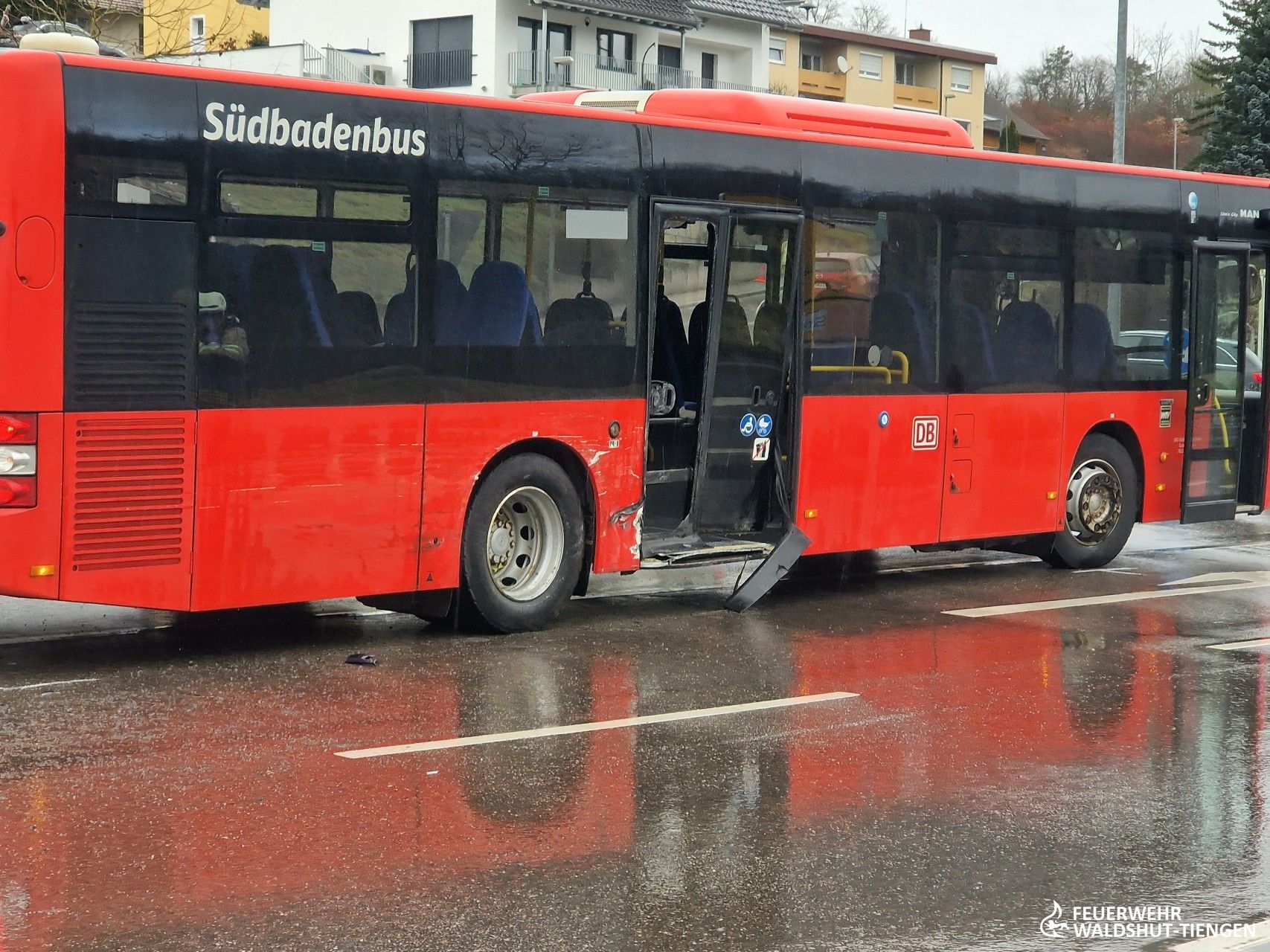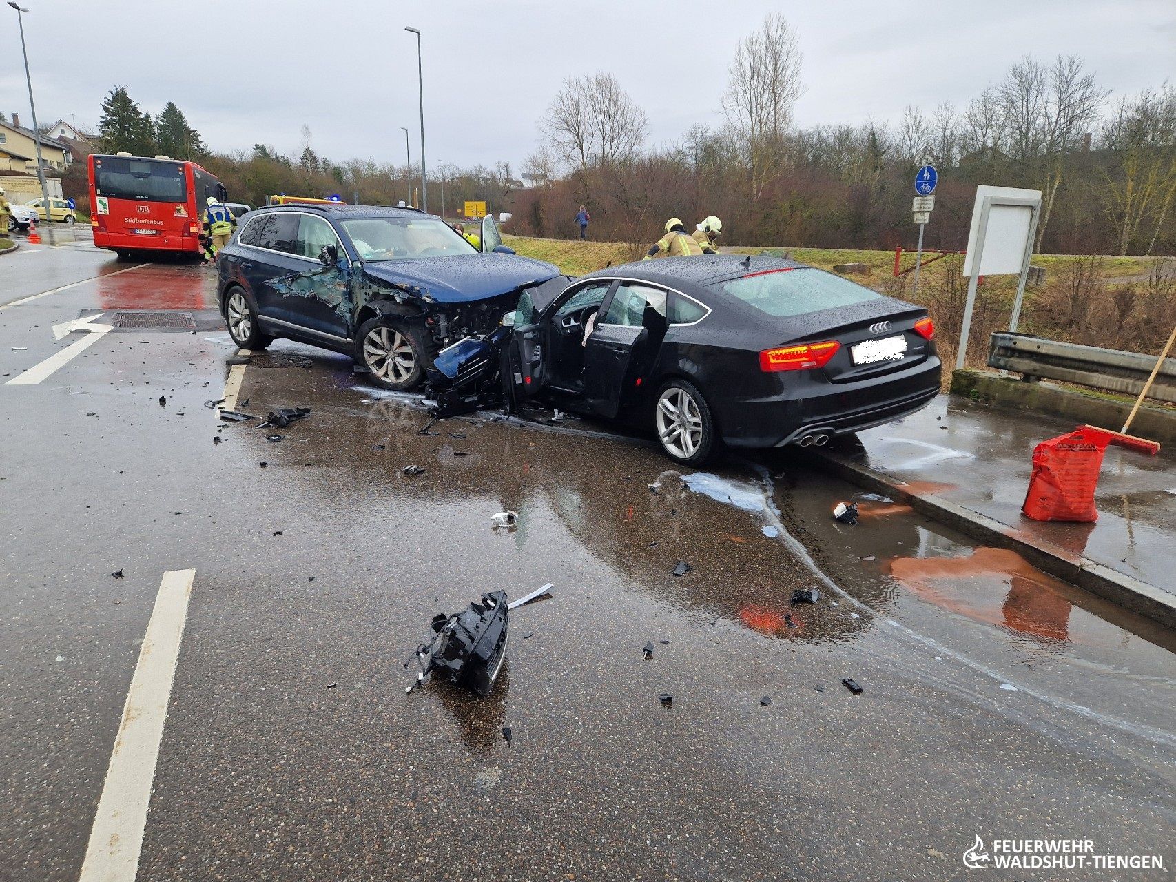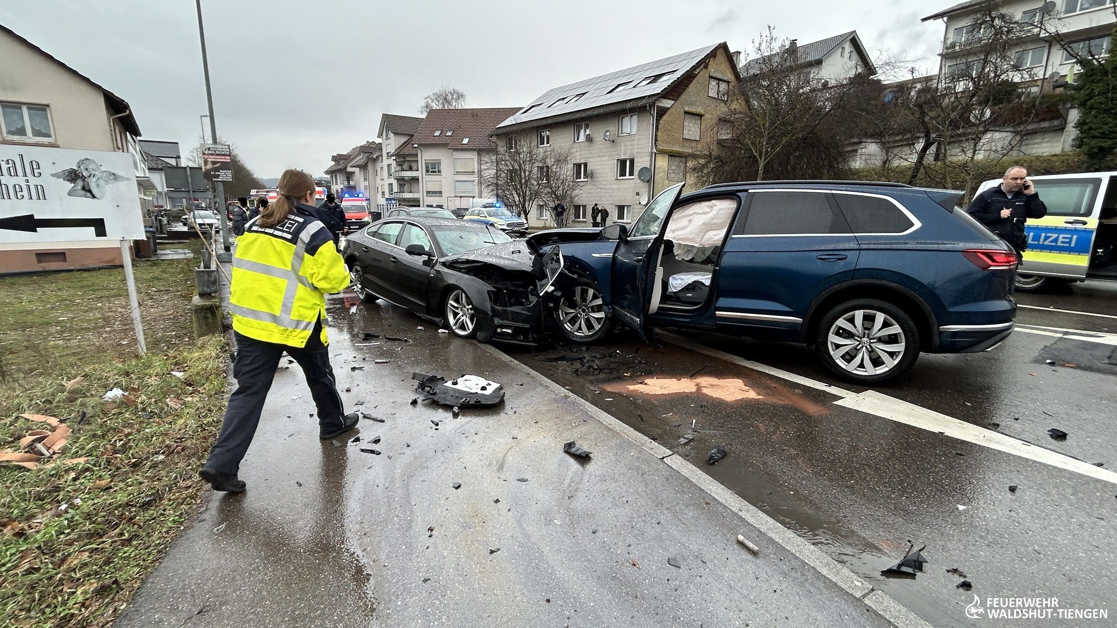 Innerhalb des Stadtteils Tiengen waren in Fahrtrichtung Lauchringen auf der B34, zwei PKW miteinander frontal kollidiert. Auch ein Linienbus wurde in den Unfall verwickelt. Der Rettungsdienst war mit mehren Fahrzeugen und einem Notarzt an der Einsatzstelle. Die Insassen der Fahrzeuge waren nicht eingeklemmt. Die Feuerwehr hatte die Aufgabe die Einsatzstelle abzusichern und auslaufende Betriebsmittel aufzufangen und zu binden.
