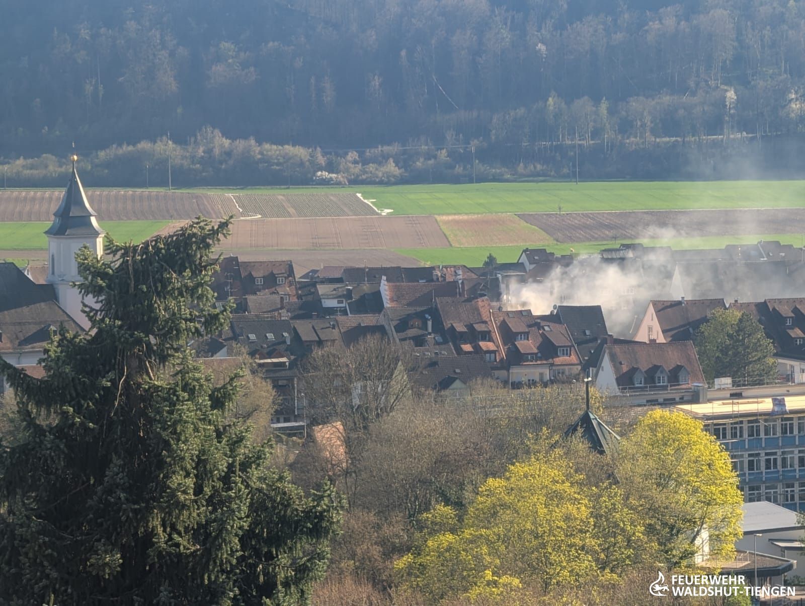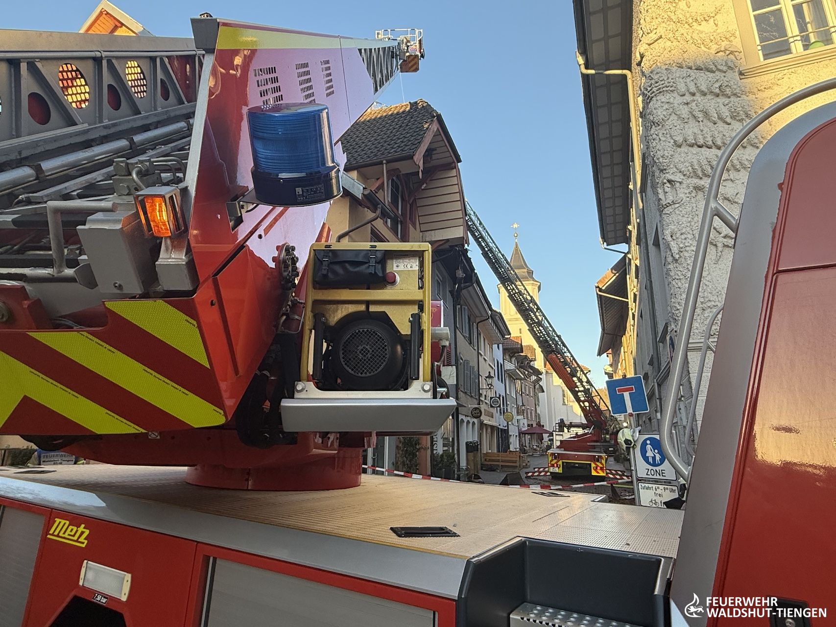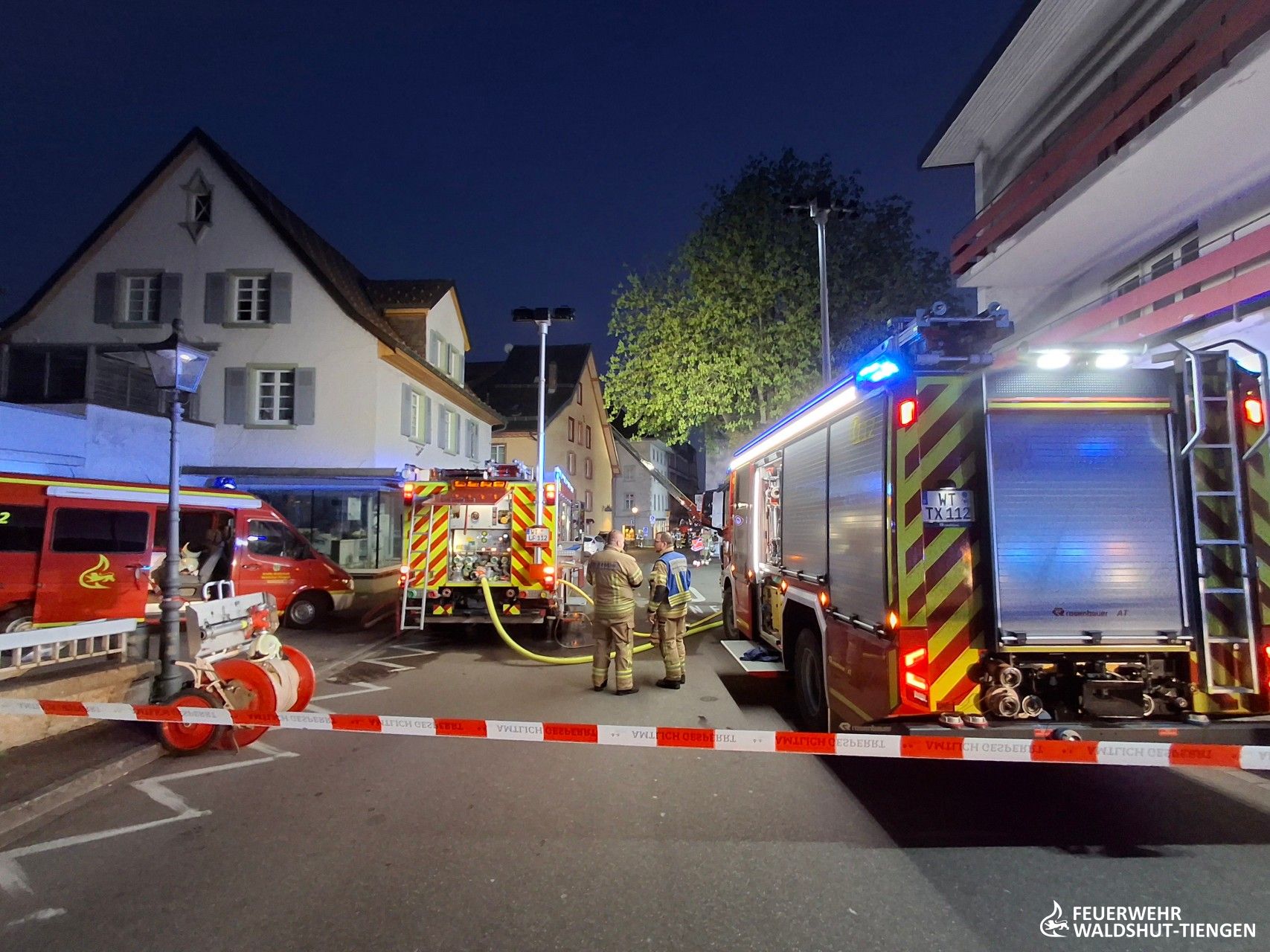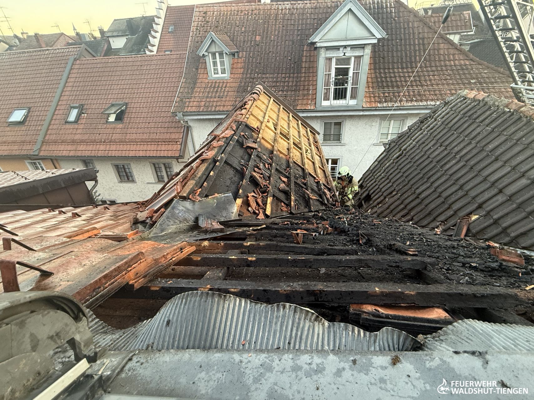 Heute am frühen Abend wurden wir zu einer unklaren Rauchentwicklung im Innenstadtbereich von Waldshut alarmiert. Weißer Rauch würde aus einem Dach aufsteigen, so die Information der Leitstelle. Kurz vor Ankunft der ersten Einsatzkräfte wurde die Meldung ergänzt, da man nun auch Flammen am Dach gesehen hatte. Die Einsatzstelle wurde weiträumig abgesperrt, da der Rauch sehr tief in die engen Straßen der Innenstadt gezogen war. Ein erster Trupp war mit einem C-Hohlstrahlrohr ins Dachgeschoss des Gebäudes vorgedrungen und atte nach dem Brand gesucht. Von außen hatte sich die Drehleiter mit einem weiteren handgeführten Strahlrohr vorbereitet und hatte erste Brandbekämpfungsmaßnahmen eingeleitet. Das Dach wurde abgedeckt und die Brandnester lokalisiert und abgelöscht. Da der Brand in der Dämmschicht sich ausbreitete, hatte man eine zweite Drehleiter hinzugeholt und die Einsatzkräfte gesichert auf das Dach gebracht. Die Ziegel konnten nun rasch entfernt werden und die Dammmaterialien abgelöscht und entfernt werden. Gegen Mitternacht waren alle Glutnester gelöscht und ausgeräumt, die Einsatzkräfte konnten die Fahrzeuge wieder aufrüsten und die Einsatzbereitschaft wieder herstellen.