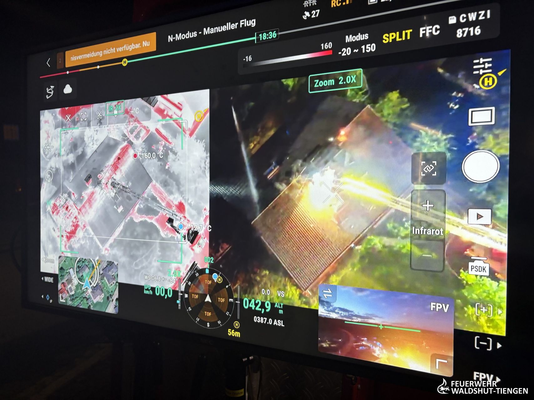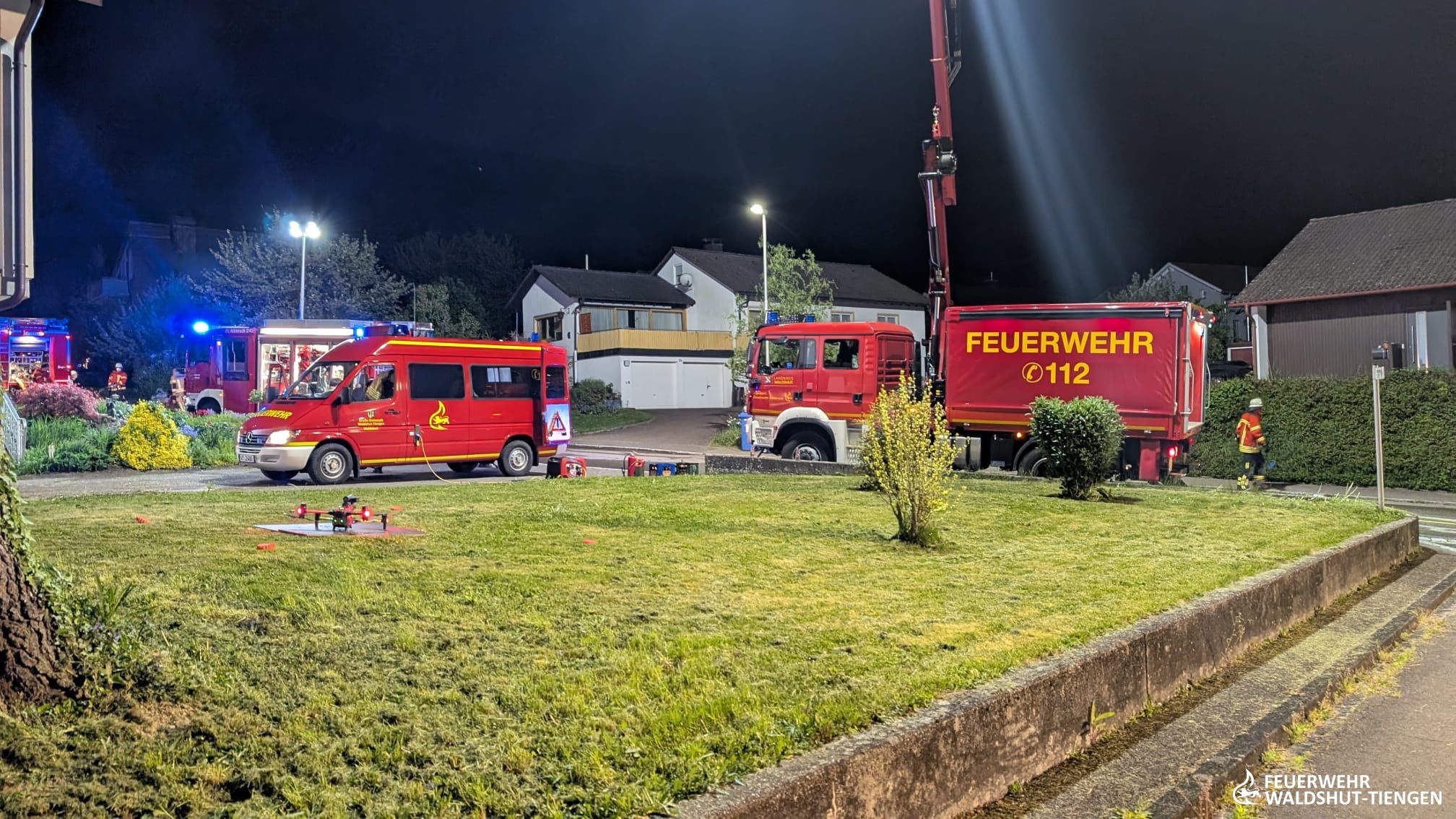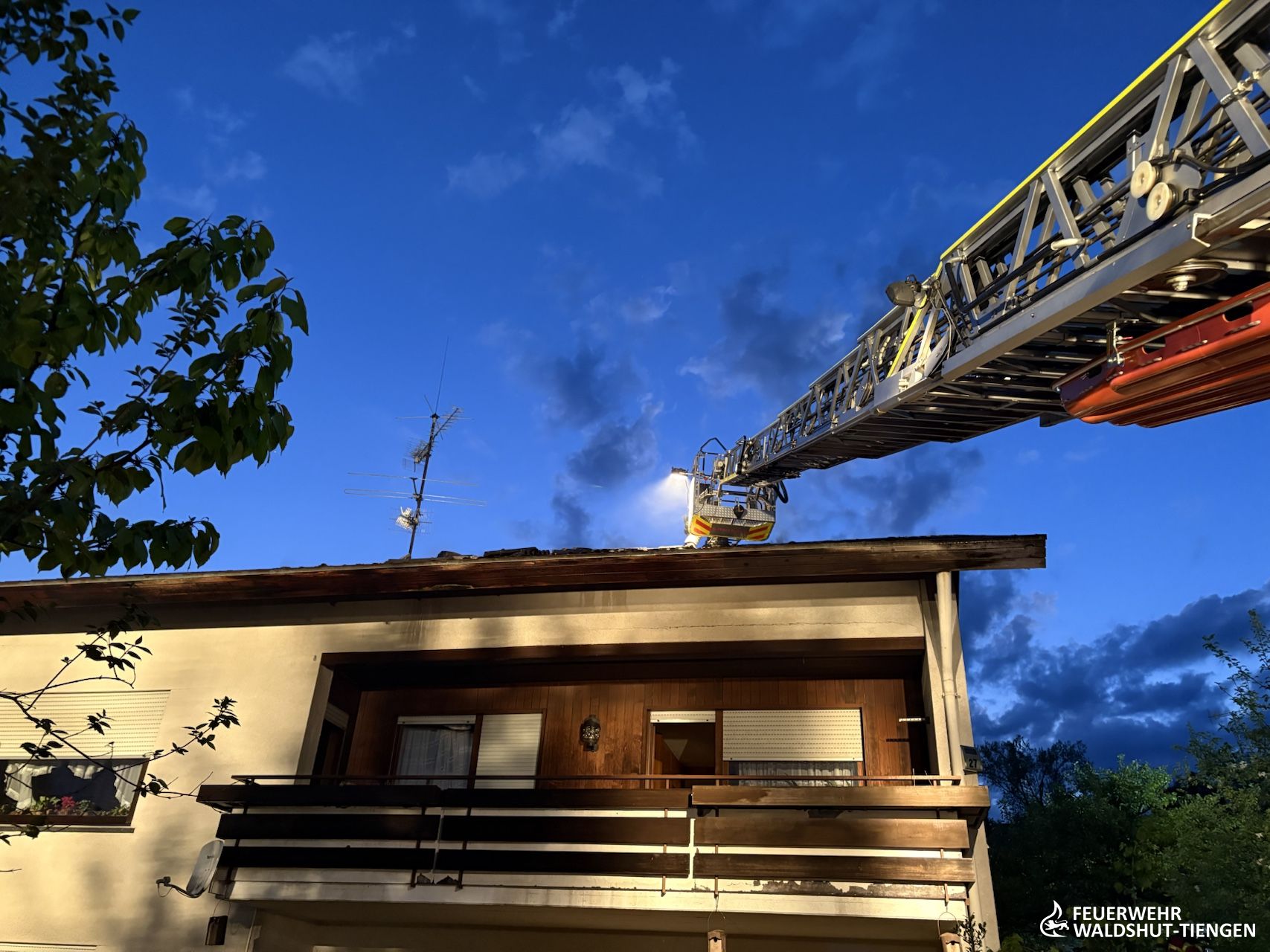 Die Feuerwehr Waldshut-Tiengen war zu einem Dachstuhlbrand mit der Drehleiter und einel Löschfahrzeug in die Gemeinde Albbruck alarmiert worden. Dort istr ein Brand von einer Terrasse auf eine nahestehende Garage und letztlich auch auf den Dachstuhl übergegriffen. Die Löschmaßnahmen wurden von der Drehleiter unterstützt, das Dach wurde geöffnet und Glutnester abgelöscht. Da auch die Wasserversorgung anfangs kritisch war, wurde der SW 2000 Tr, der in der Abteilung Tiengen stationiert ist, ebenfalls alarmiert. Dieser musste nicht mehr eingesetzt werden und konnte früh wieder aus dem Einsatz entlassen werden. Der Einsatzleitwagen der Feuerwehr Waldshut-Tiengen hatte die Einsatzleitung vor Ort in Kommunikation und Dokumentationion unterstützt. Im Einsatz war auch die Drohne des Landkreises Waldshut, welche Luftaufnahmen und Wäremebilder der Einsatzleitung zur Verfügung stellte.