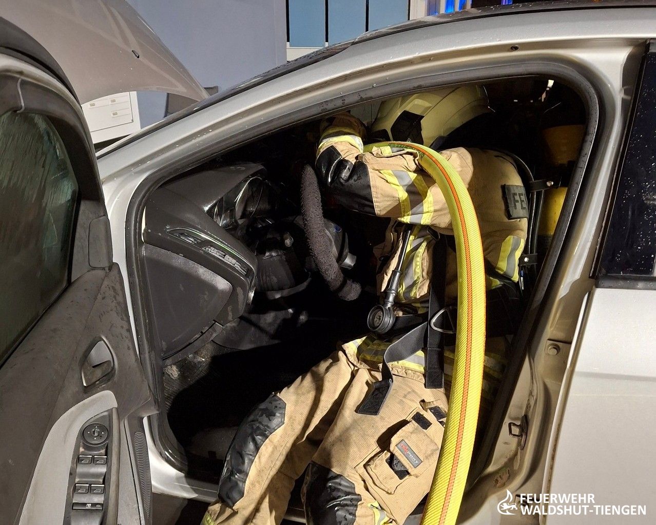 Die Feuerwehrabteilung Waldshut wurde heute Abend zu einem Fahrzeugbrand alarmiert. Es galt einen Entstehungsbrand im Motrorraum abzulöschen. Mittels der Schnellangriffsleitung war der Brand schnell unter Kontrolle gebracht worden. Der Brand hatte sich bereits in das Fahrzeuginnere durch das Armaturenbrett erweitert. Mit einem Wasser-Schaumgemisch hatte man den Brand letztlich vollends abgelöscht.