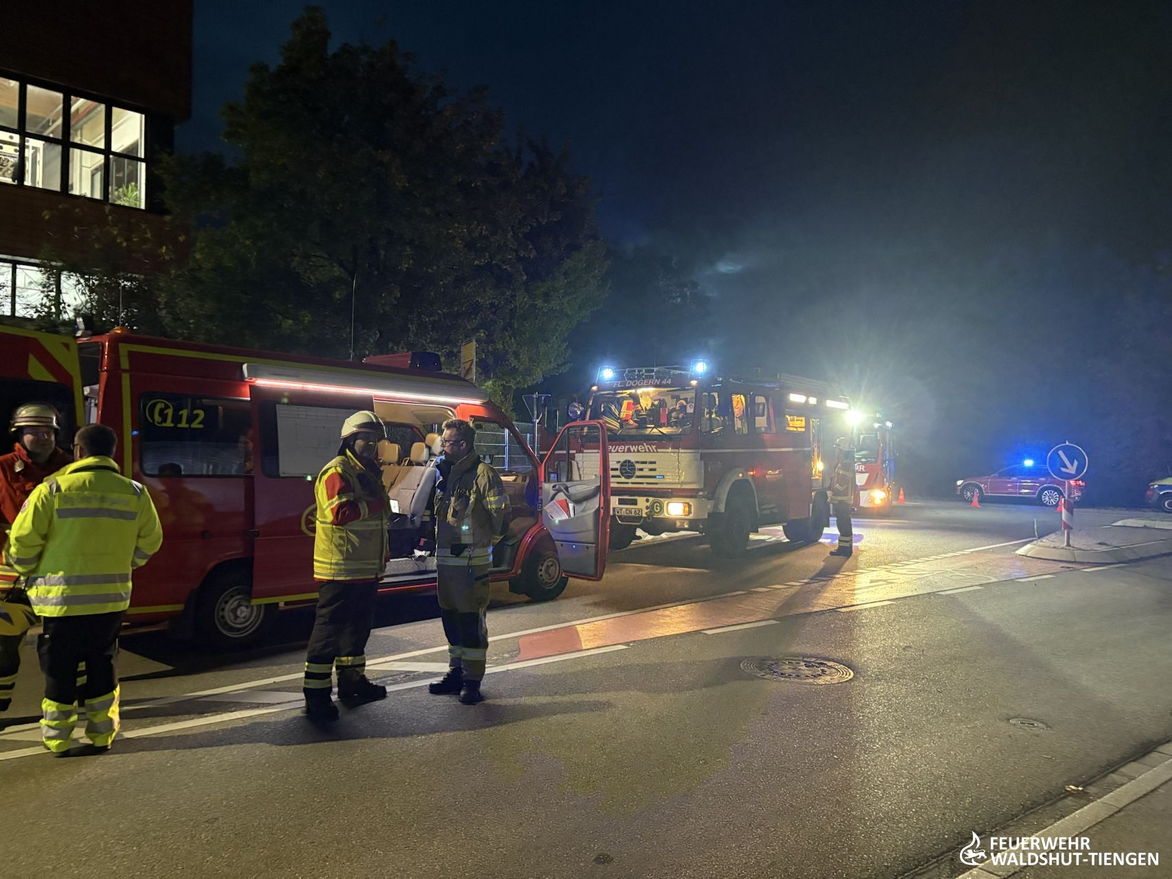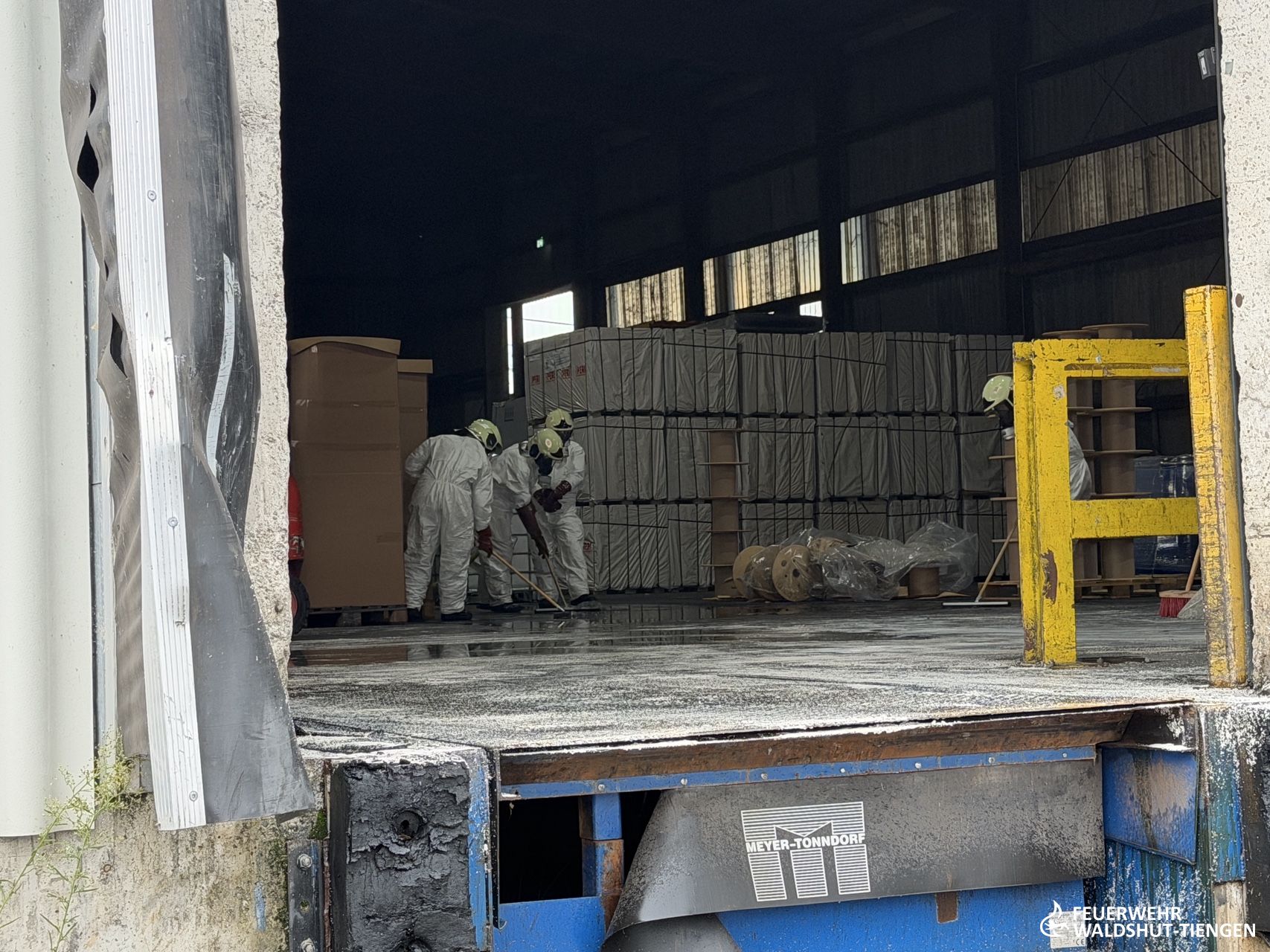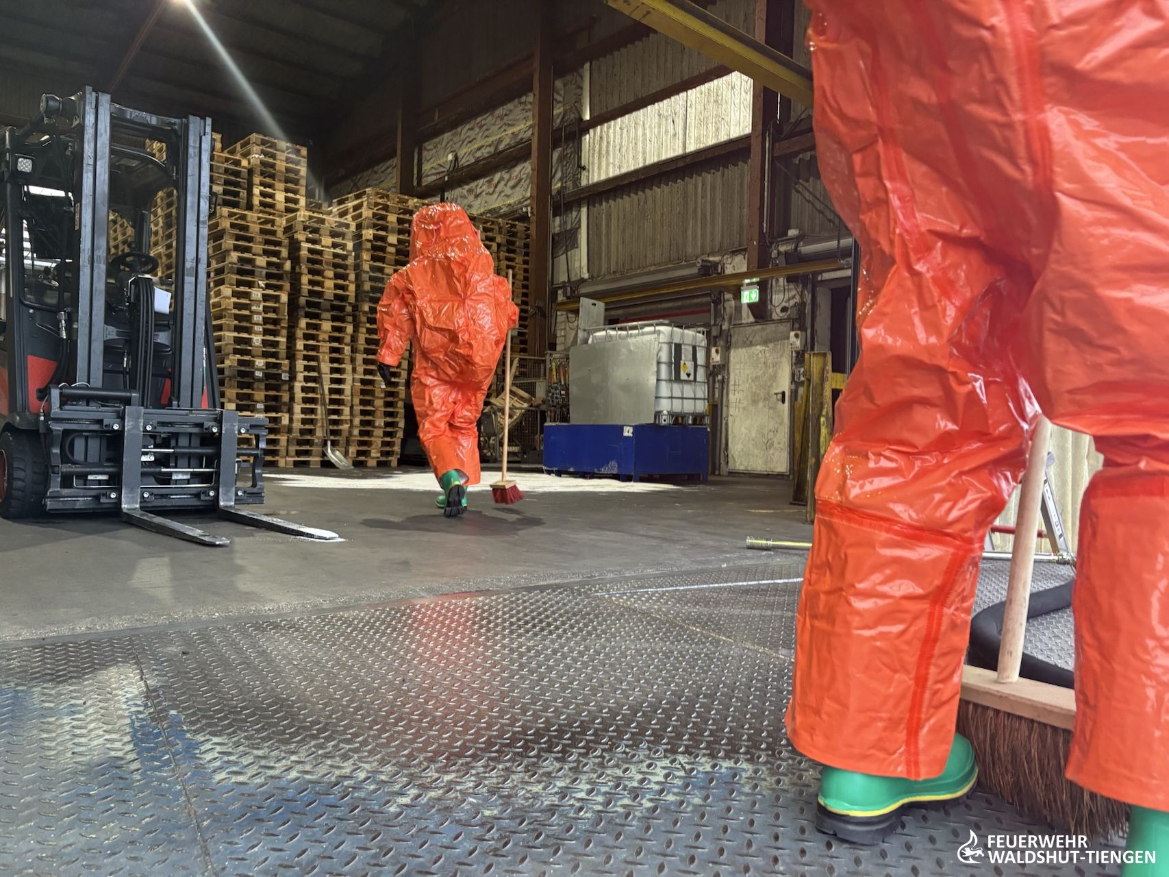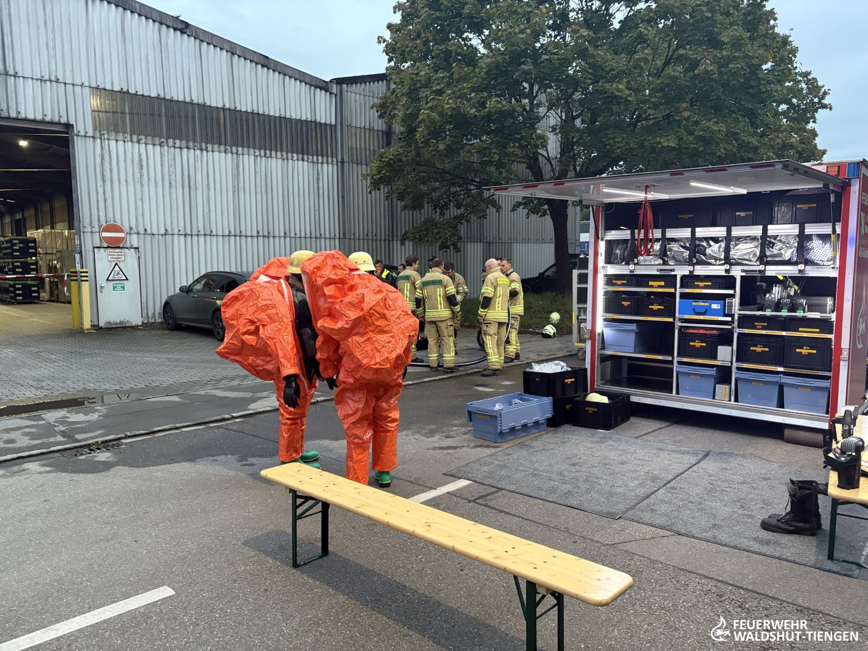 Heute am frühen Morgen wurde der Gefahrstoffzug zu einem Stoffaustritt in einen Gewerbebetrieb in Dogern alarmiert. Ein 1000l Transportbehälter wurde beschädigt und Wasserstoffperoxid trat aus, durch deren Zersetzung war ein Nebel wahrzunehmen. Die Mitarbeiter der Firma reagierten schnell und hatten den Cubitainer auf ein Haveriebock gestellt. Die örtliche Feuerwehr hatten den Gefahrenbereich abgesperrt und war nach dem GAMS-Schema vorgegangen. Menschen waren keine mehr im Gefahrenbereich. Das Wasserstoffperoxid aus dem beschädigte Behälter wurde umgepumpt und die ausgelaufene Flüssigkeit im Gebäude ausgespült und entfernt. Unter Schutzanzügen und umluftunabhängigem Atemschutz hatten die Einsatzkräfte diese Arbeit durchgeführt.