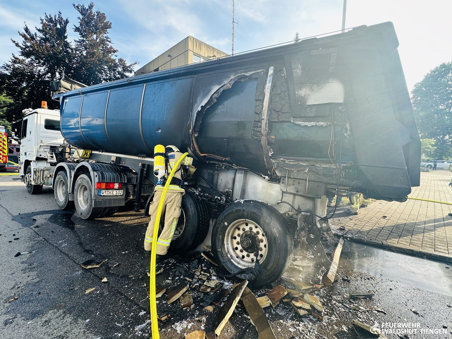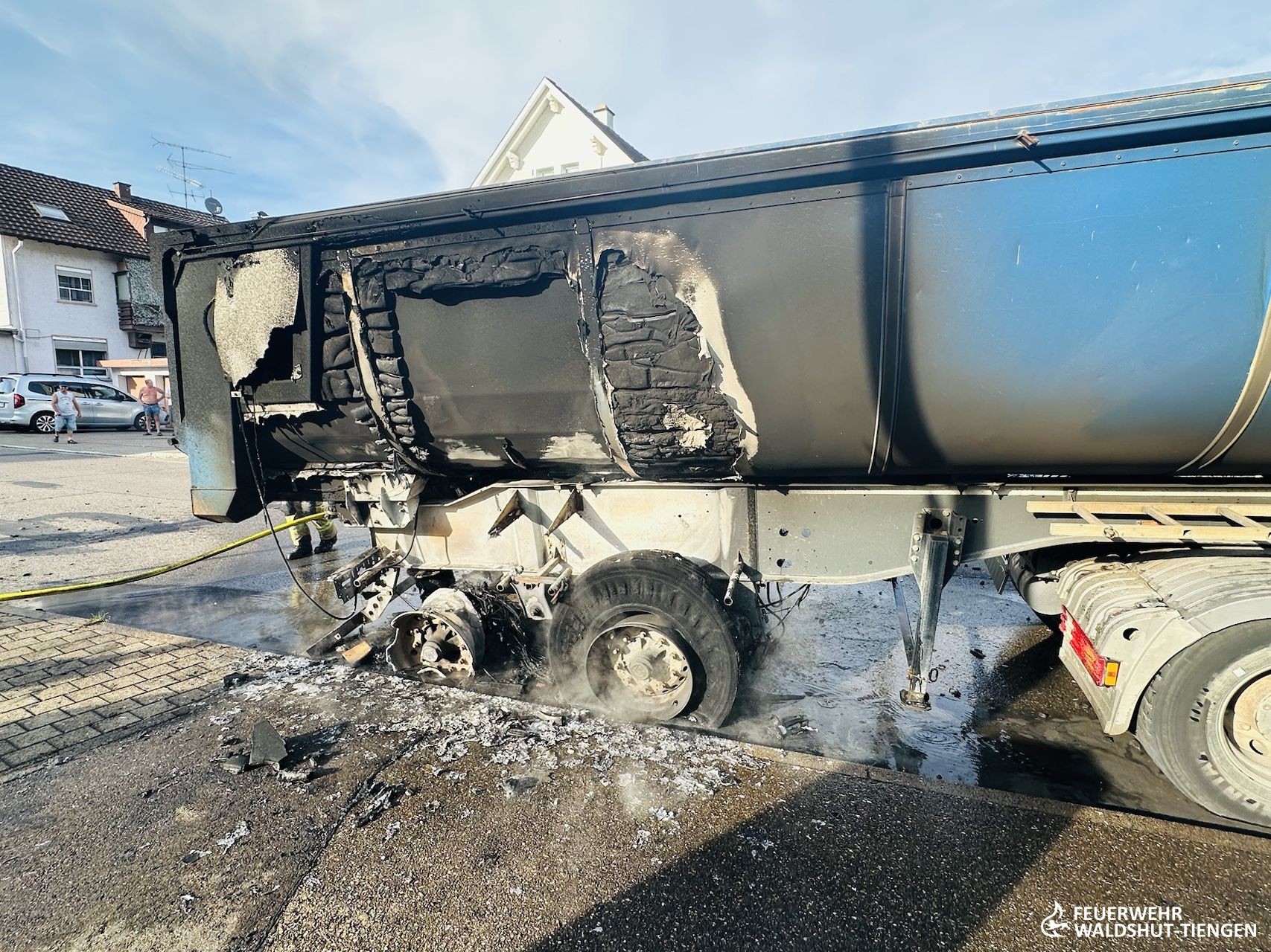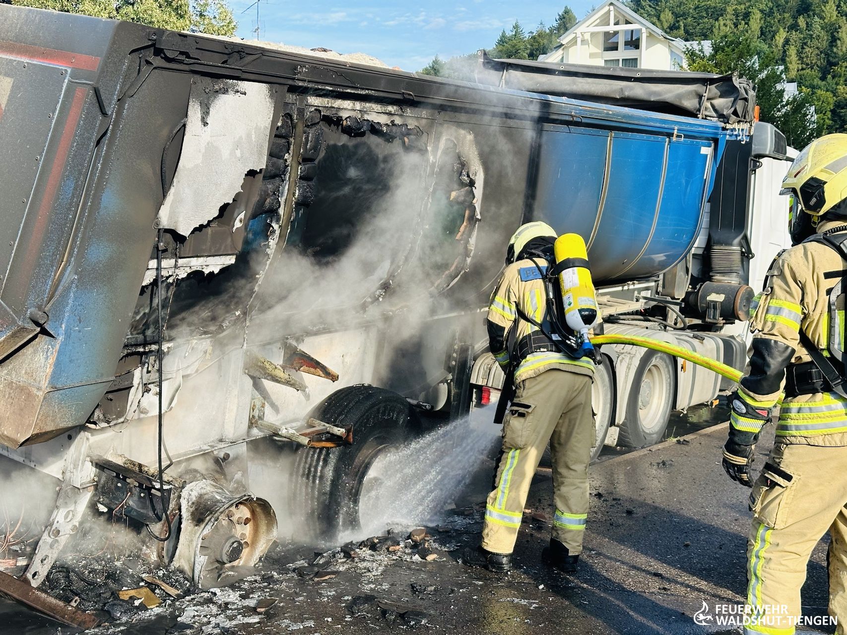 Ein beladener LKW war im Stadtteil Tiengen in Brand geraten. Eine dunkle Rauchsäule hatte den Einsatzkräften schon weit den Einsatzort angezeigt. Beim Eintreffen der Einsatzkräfte brannte der LKW im Bereich der Hinterachsen. Ein Trupp unter umluftunabhängigem Atemschutz hatte mit einem C-Hohlstrahlrohr den Brand rasch unter Kontrolle gebracht und gelöscht. Der Fahrer wurde nicht verletzt, an dem Fahrzeug entstand ein hoher Schaden.
