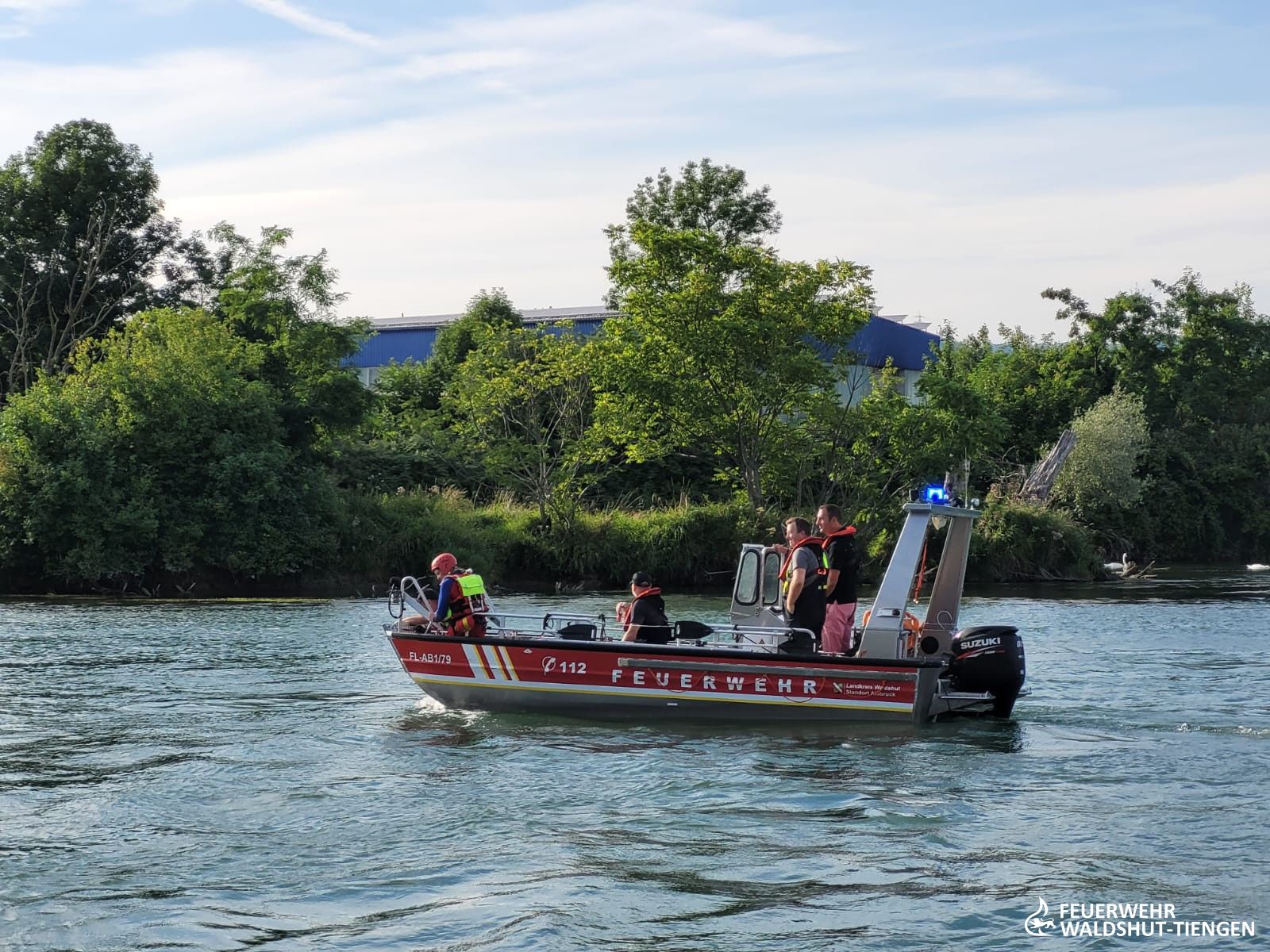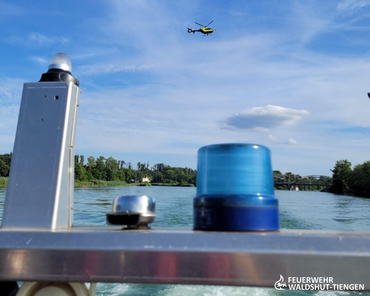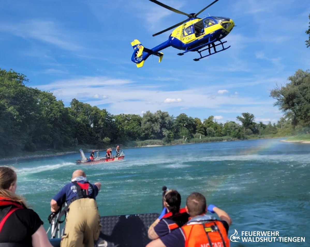 Eine Person ging offensichtlich am Badebereich Lauffen/Ettikon unter und wurde nicht mehr von den begleitenden gesehen. Die Alarmierungskette brachte Feuerwehr, DLRG, Rettungsdienst und Notarzt und auch die Polizei in Bewegung. An der Suche wurde auch ein Rettungshubschrauber aus der Schweiz eingebunden. Die Einsatzkräfte besetzten die Boote der Feuerwehr, DLRG und der schweizer Polizei. Man suchte flussaufwärts die Person, an der zuletzt angegeben Stelle. Der Rettungshubschrauber hatte kurz eine im Unterwasser treibende leblose Person ausfindig gemacht, diese war jedoch wieder abgetaucht und nicht weidergesehen. Nach einer mehrstündigen Suche, wurde der Einsatz leider erfolglos abgebrochen.