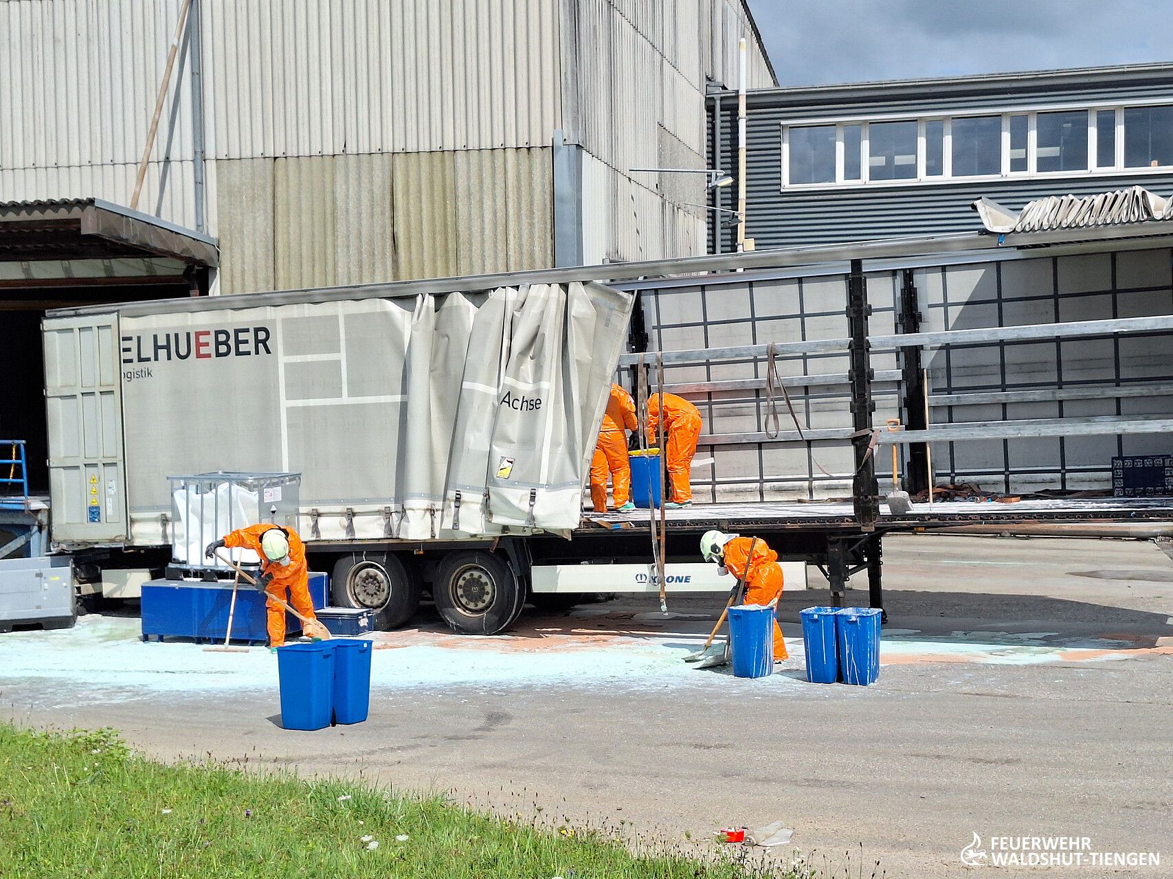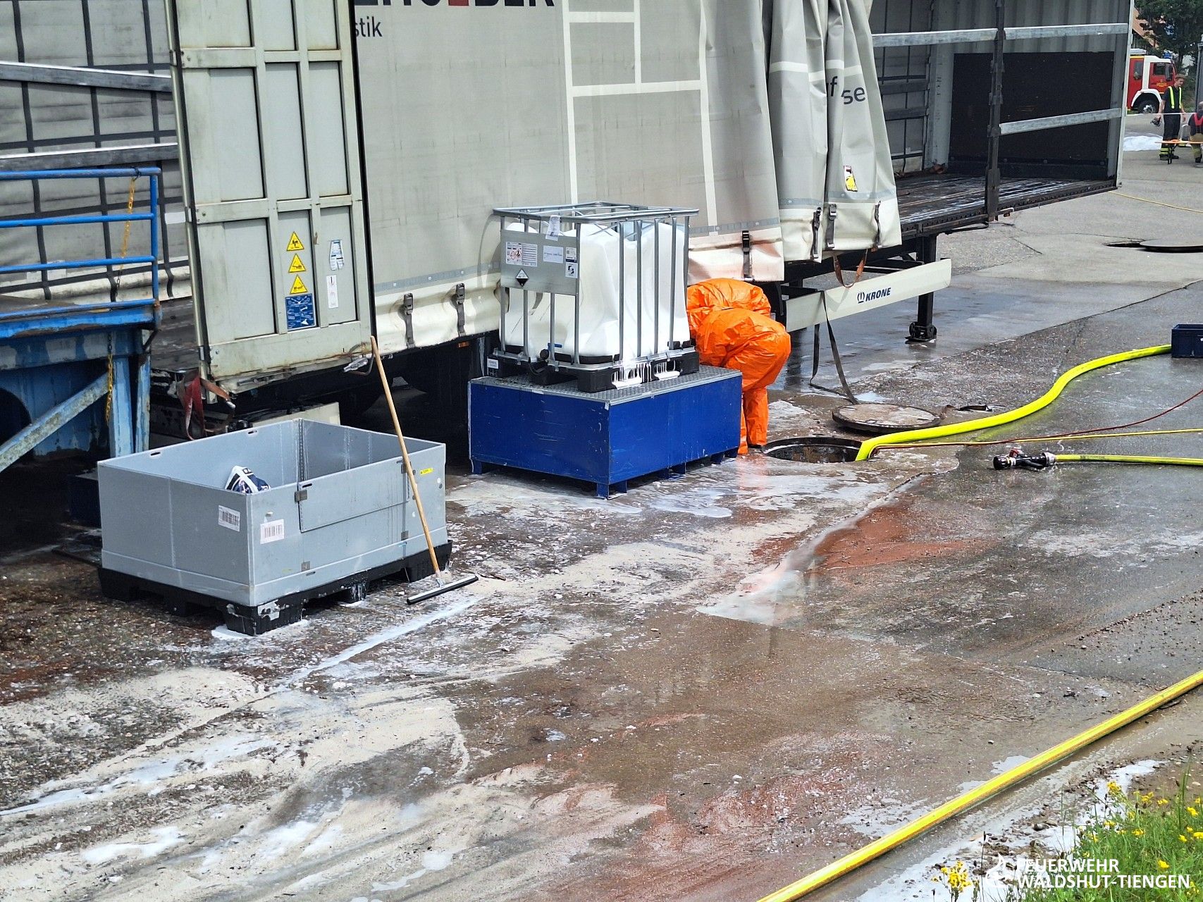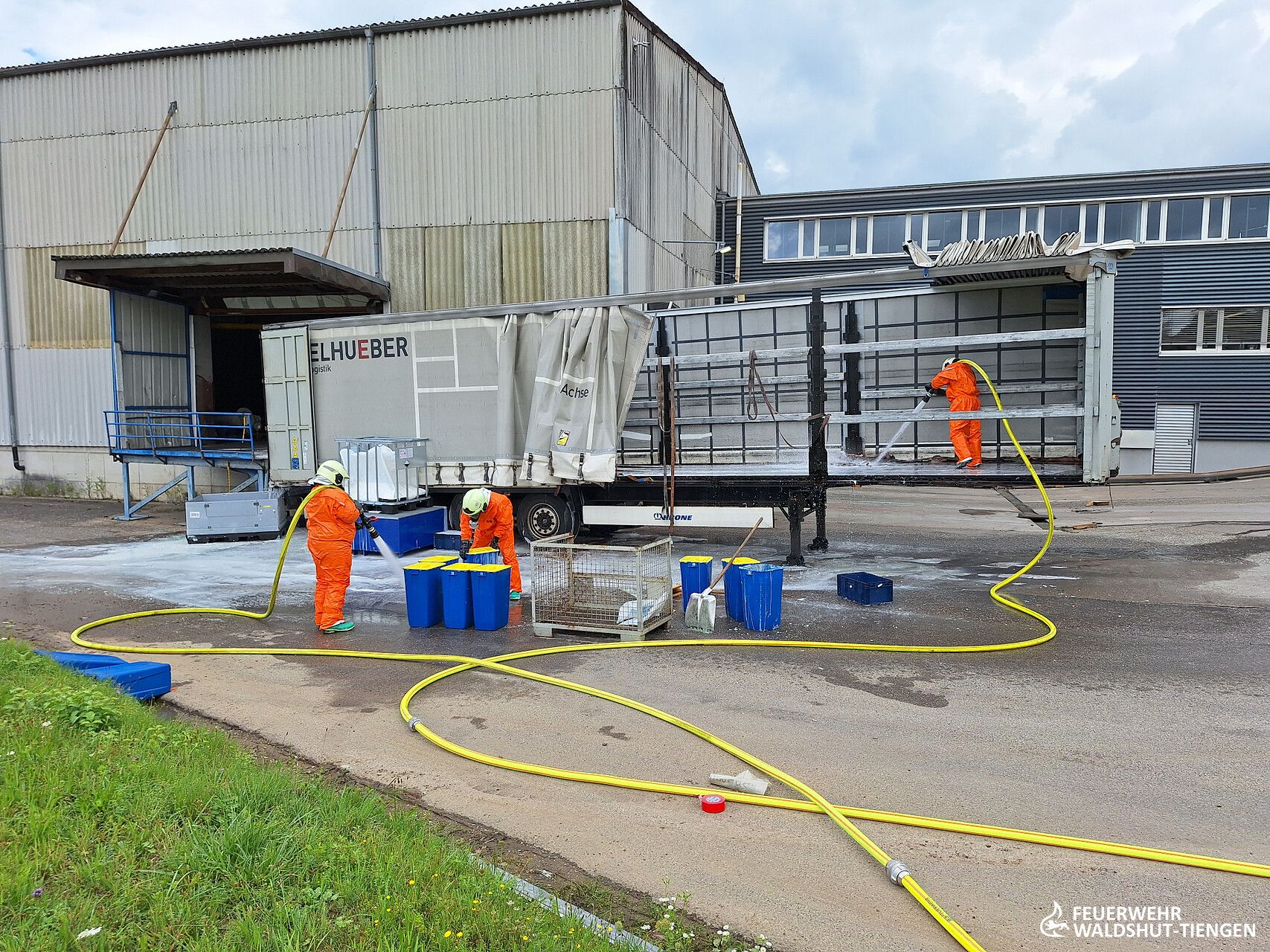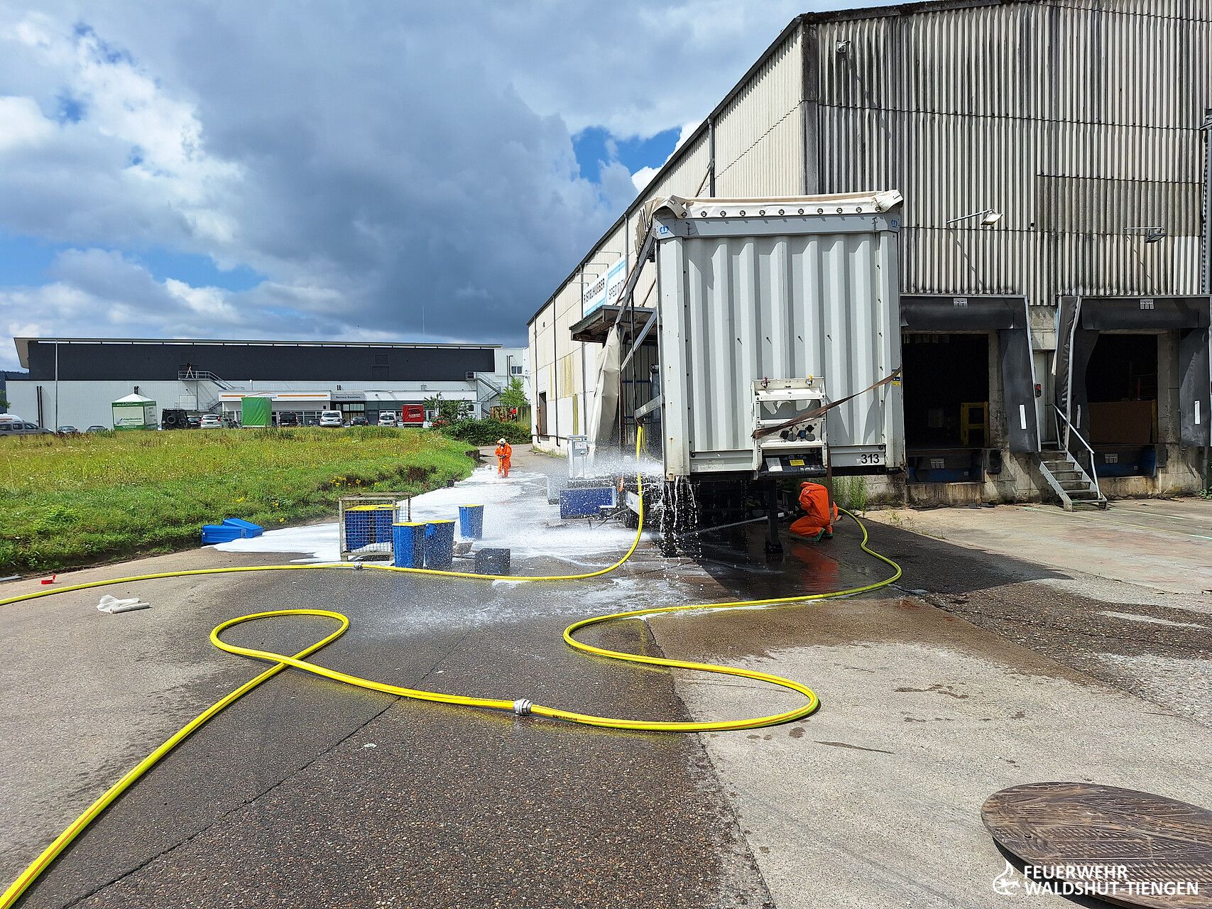 Mehrere Trupps, ausgestattet mit Schutzkleidung der Form 2 und PSA, begannen sofort mit der Identifikation des Stoffes und der Messung der Gefährdung. Durch den Abgleich mit der Ladeliste konnte der Stoff als "Härter, Kauramin 1690" (UN3412) identifiziert werden. Die Messungen ergaben, dass die Konzentrationen in einem Bereich lagen, der keine unmittelbare Gefahr darstellte. Zur Eindämmung des Stoffes wurde Bindemittel eingesetzt. In der Zwischenzeit wurde der Stoff sicher mit Schaufeln und Wasserschiebern aufgenommen, um weitere Kontaminationen zu verhindern. Parallel dazu wurde ein Sicherheitstrupp zur Überwachung und ein Dekontrupp zur Unterstützung der Dekontaminationsmaßnahmen eingesetzt. Zur Minimierung der Gefährdung wurde auch das kontaminierte Gelände gespült und der ausgelaufene Stoff verdünnt.