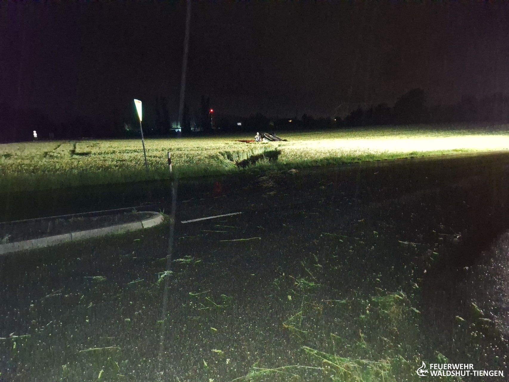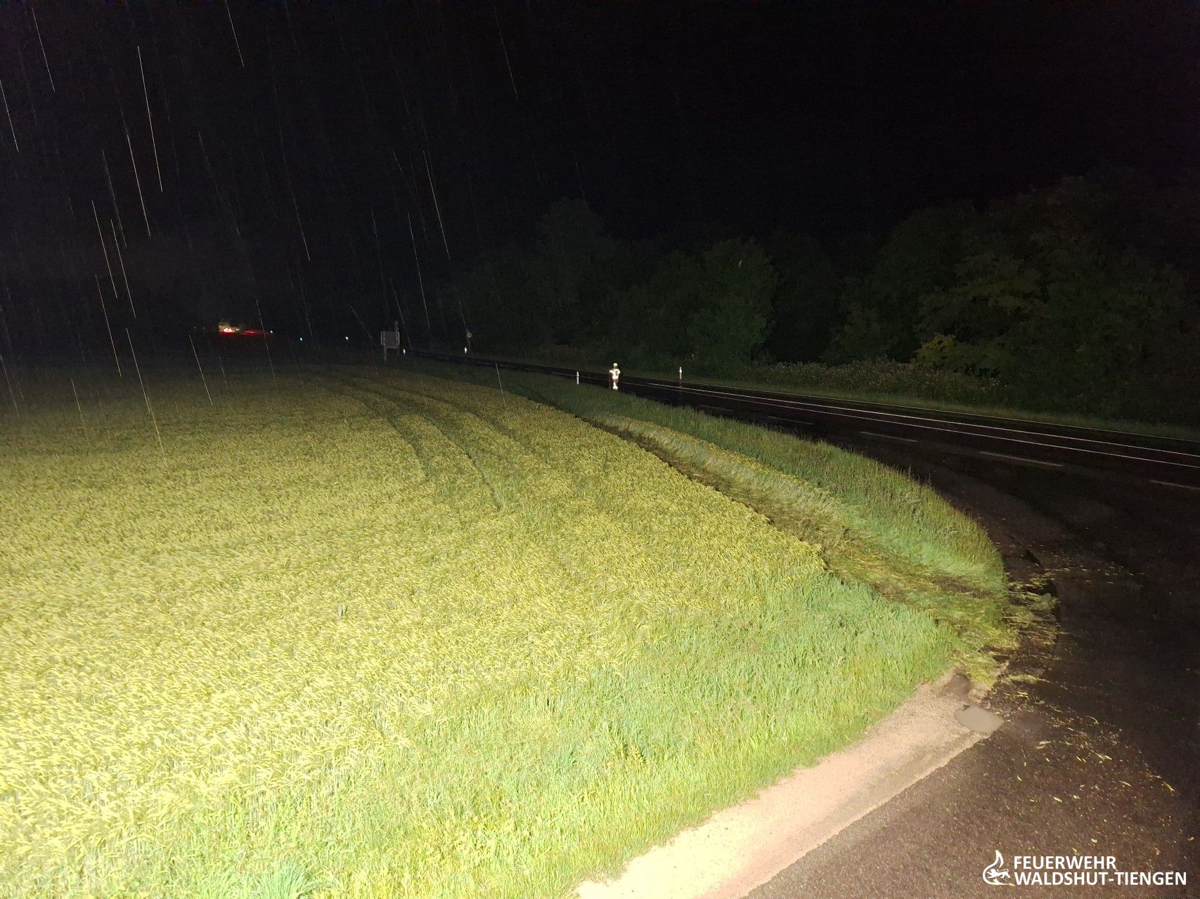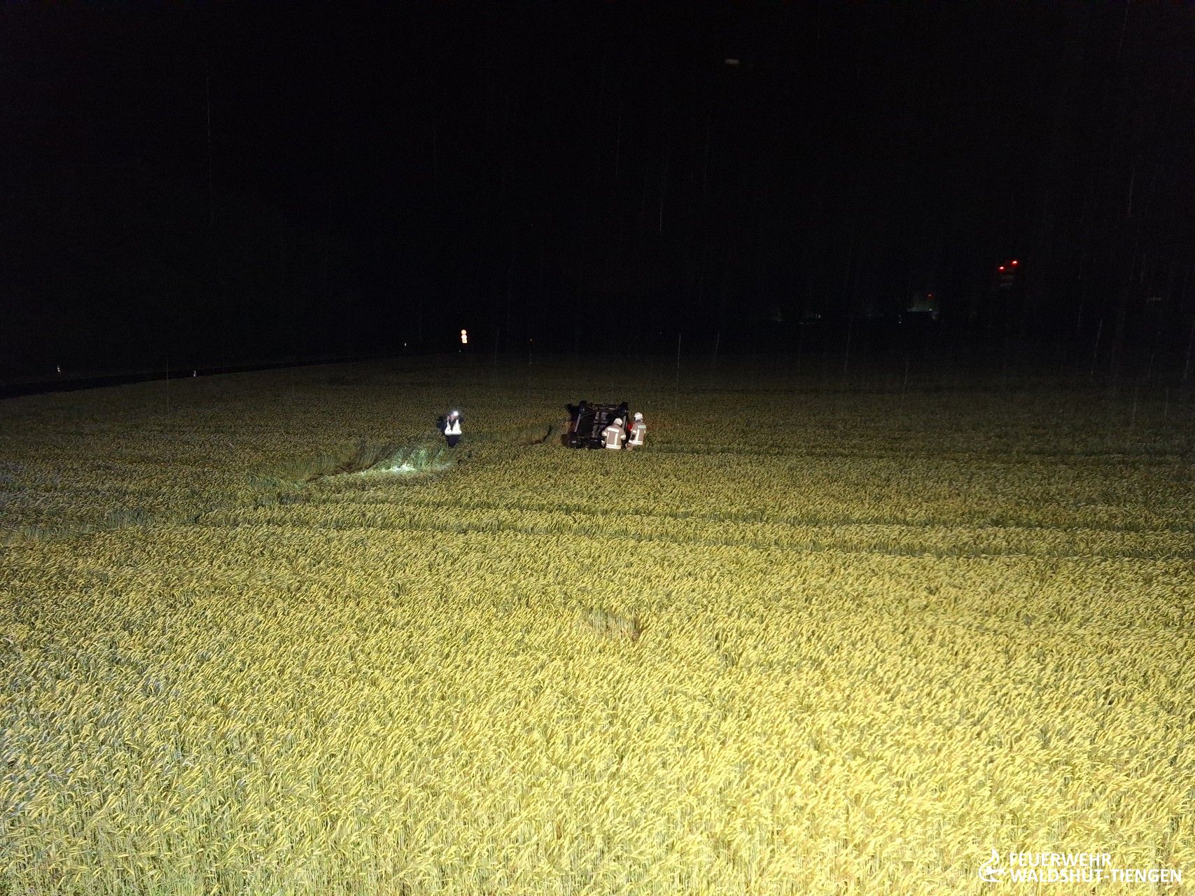 Ein PKW war auf der L161 zwischen Gurtweil und dem Gewerbegebiet Kaitle von der Fahrbahn abgekommen und in ein Feld gefahren. Am Ende eds Feldes hatte er eine Straße überquert und ist dabei abgehoben und in einem weiteren Feld aufgekommen, dabei hatte sich das Fahrzeug mehrmals überschlagen. Der Fahrer hatte das Fahrzeug selbst verlassen können und den Notruf wählen. Der Rettungsdienst hatte sich um den Fahrer gekümmert und diesen auch zur Abklärung in ein Krankenhaus gebracht. Die Feuerwehr leuchtete die Einsatzstelle aus und hatte die Bergung des Fahrzeuges unterstützt.