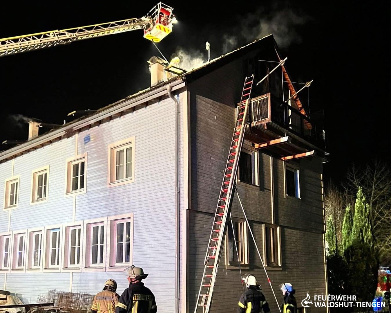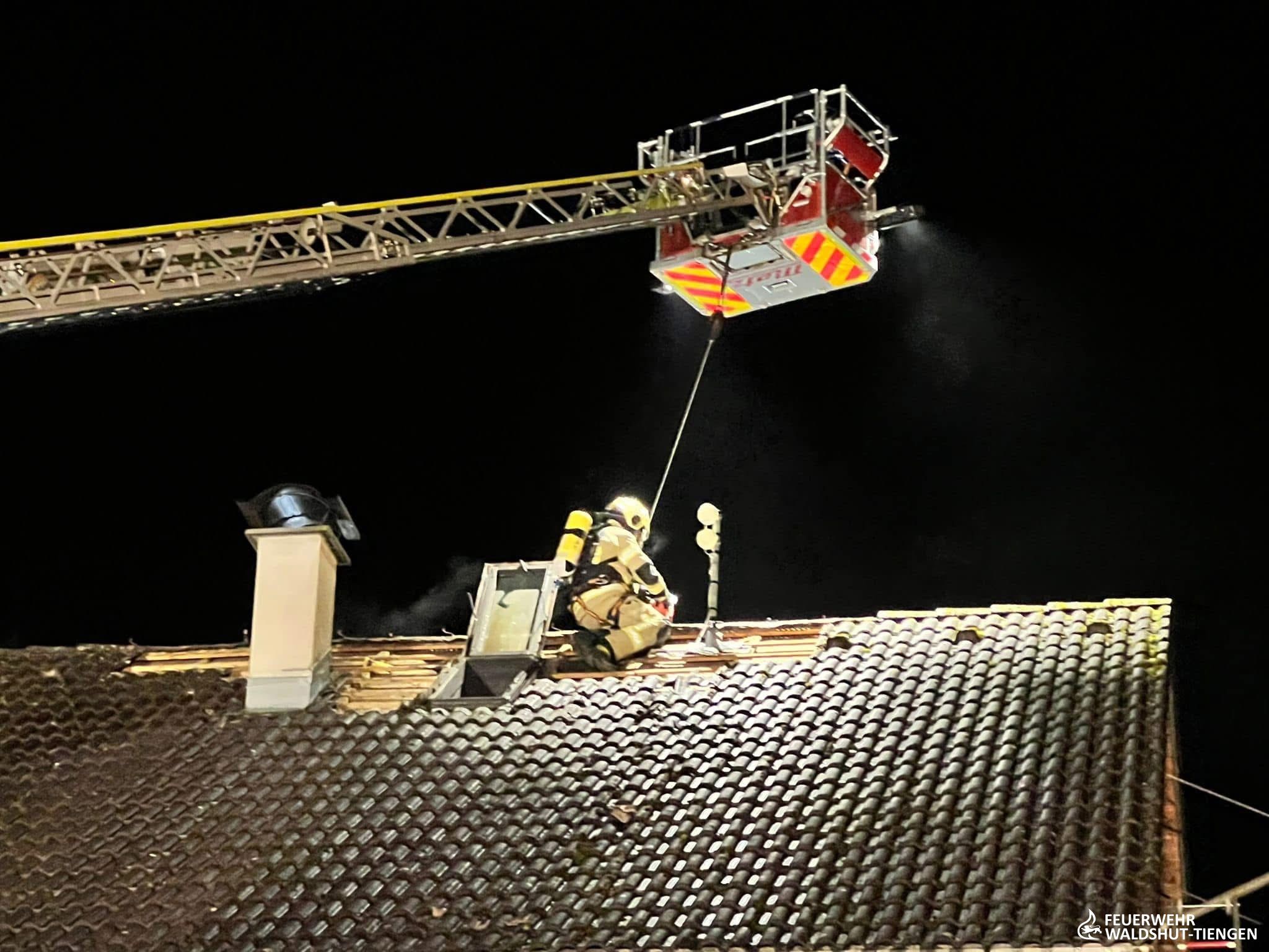 Die Drehleiter und ein Löschgruppenfahrzeug der Abteilung Tiengen waren heute Abend in die Gemeinde Küssaberg ausgerückt. Dort wurde ein Wohnungsbrand in einem Mehrfamilienhaus gemeldet. Glücklicherweise konnten alle Bewohner das Gebäude unbeschadet verlassen, da diese durch die ausgelösten Rauchwarnmelder gewarnt wurden. Die Drehleiter war in Stellung gebracht worden um das Dach telweise abzudecken und dort ggf. auch eine Abluftoffnung zu schaffen. Durch den raschen und gezielten Innenangriff, konnte ein Ausbreitung auf den Dachstuhl verhindert werden.