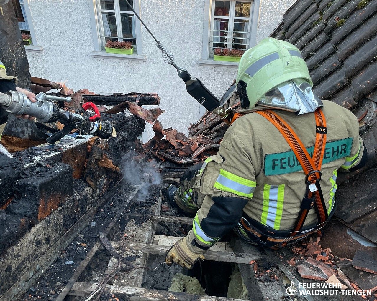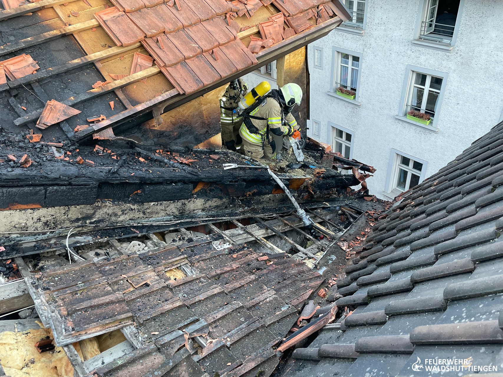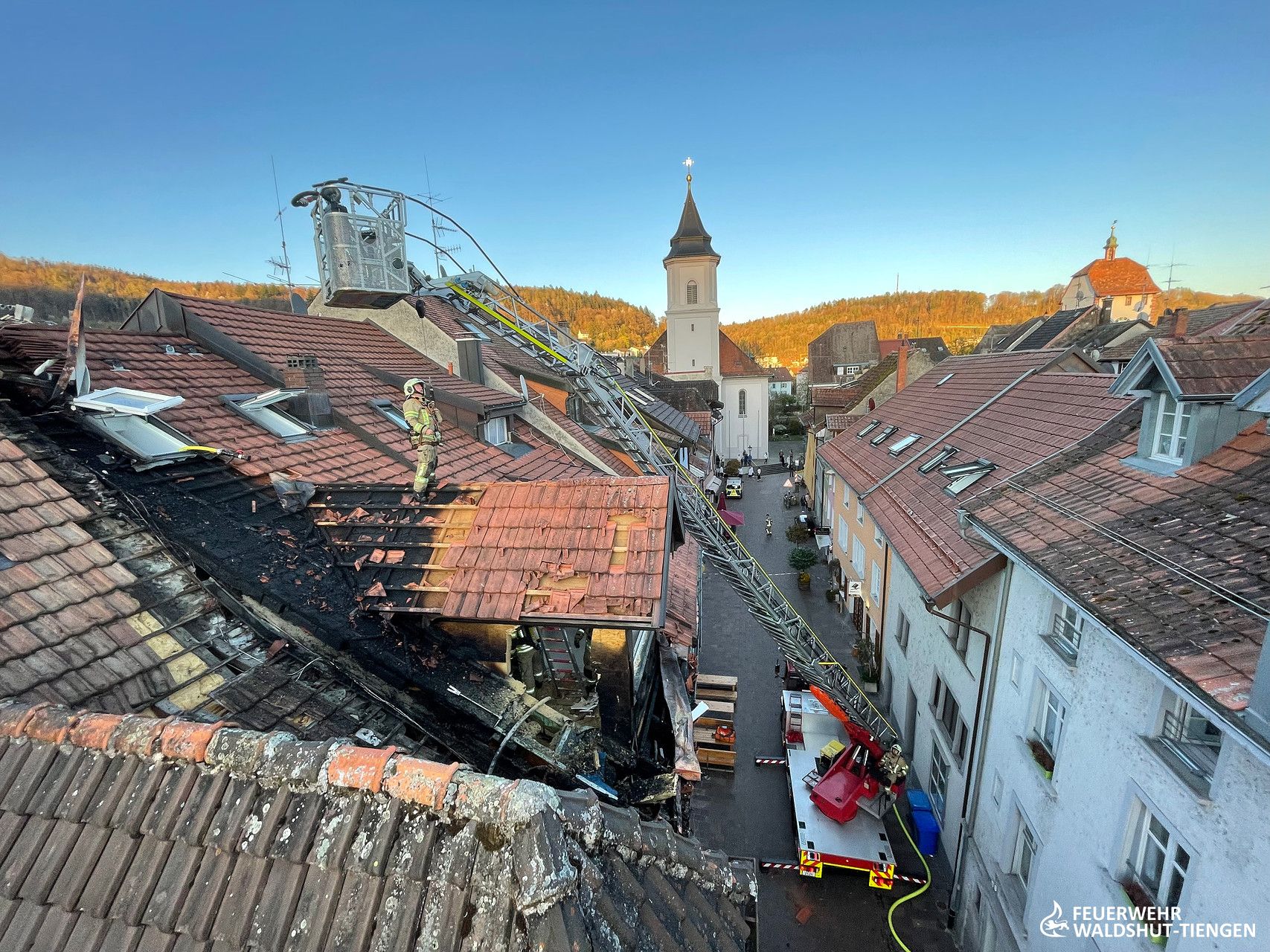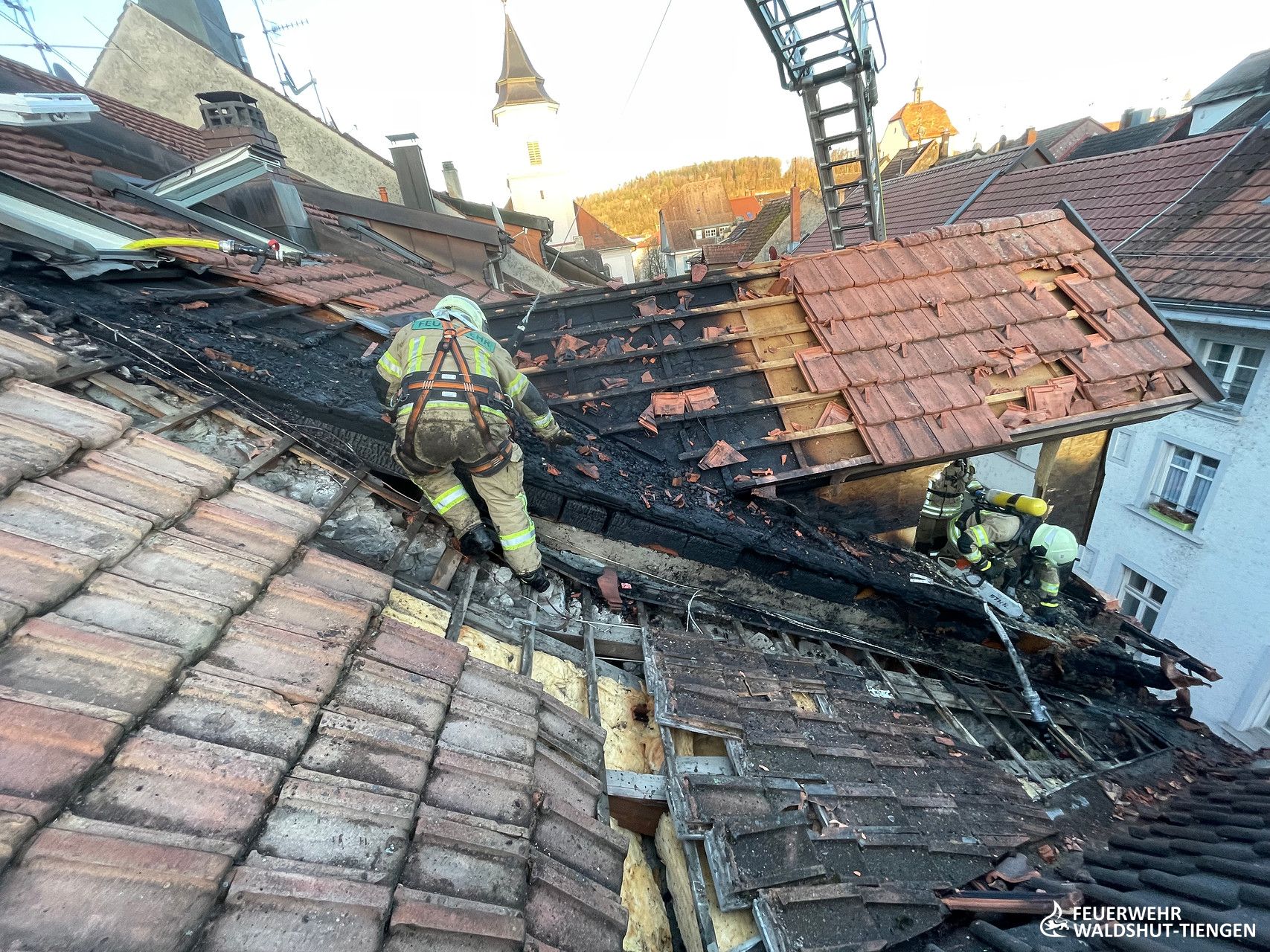 Heute am frühen Abend wurden wir zu einer unklaren Rauchentwicklung im Innenstadtbereich von Waldshut alarmiert. Weißer Rauch würde aus einem Dach aufsteigen, so die Information der Leitstelle. Kurz vor Ankunft der ersten Einsatzkräfte wurde die Meldung ergänzt, da man nun auch Flammen am Dach gesehen hatte. Die Einsatzstelle wurde weiträumig abgesperrt, da der Rauch sehr tief in die engen Straßen der Innenstadt gezogen war. Ein erster Trupp war mit einem C-Hohlstrahlrohr ins Dachgeschoss des Gebäudes vorgedrungen und atte nach dem Brand gesucht. Von außen hatte sich die Drehleiter mit einem weiteren handgeführten Strahlrohr vorbereitet und hatte erste Brandbekämpfungsmaßnahmen eingeleitet. Das Dach wurde abgedeckt und die Brandnester lokalisiert und abgelöscht. Da der Brand in der Dämmschicht sich ausbreitete, hatte man eine zweite Drehleiter hinzugeholt und die Einsatzkräfte gesichert auf das Dach gebracht. Die Ziegel konnten nun rasch entfernt werden und die Dammmaterialien abgelöscht und entfernt werden. Gegen Mitternacht waren alle Glutnester gelöscht und ausgeräumt, die Einsatzkräfte konnten die Fahrzeuge wieder aufrüsten und die Einsatzbereitschaft wieder herstellen.