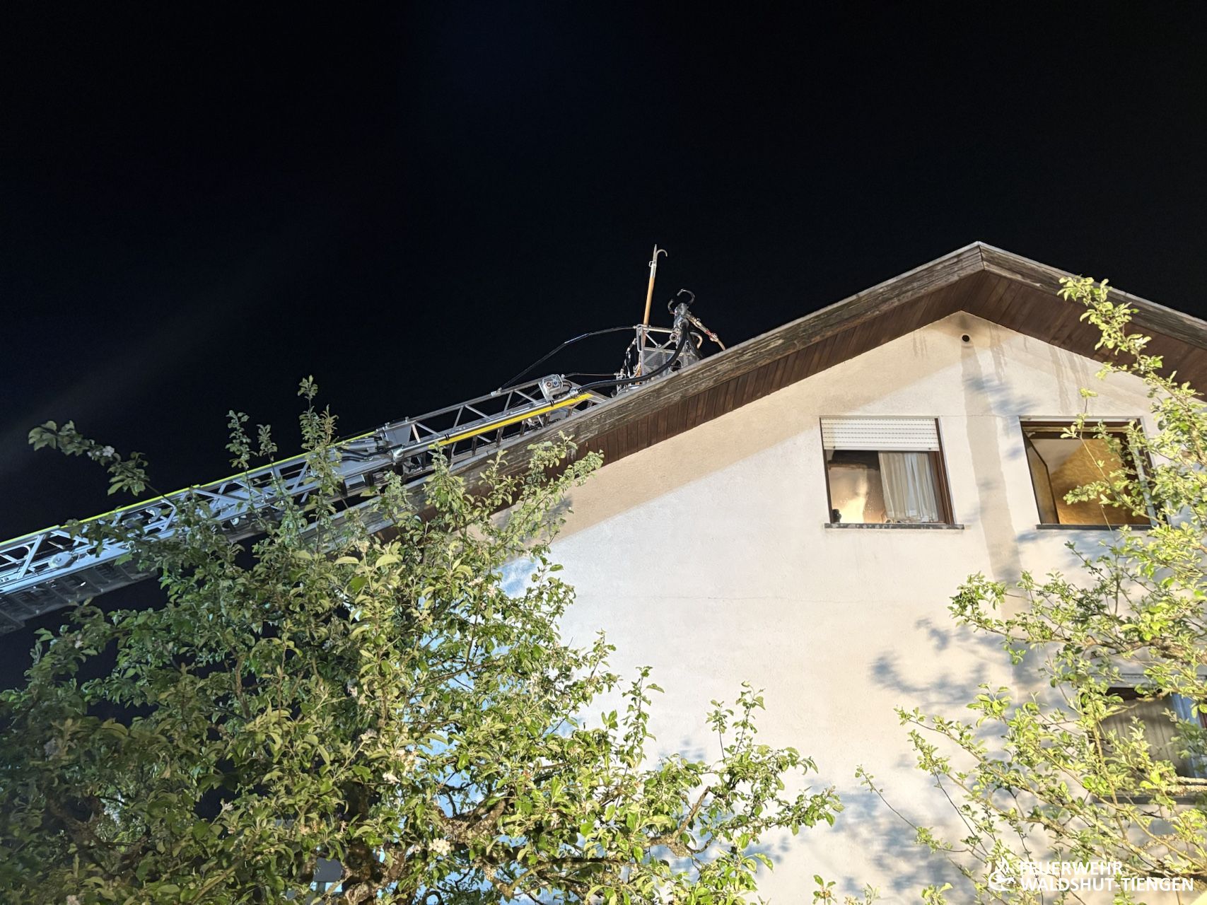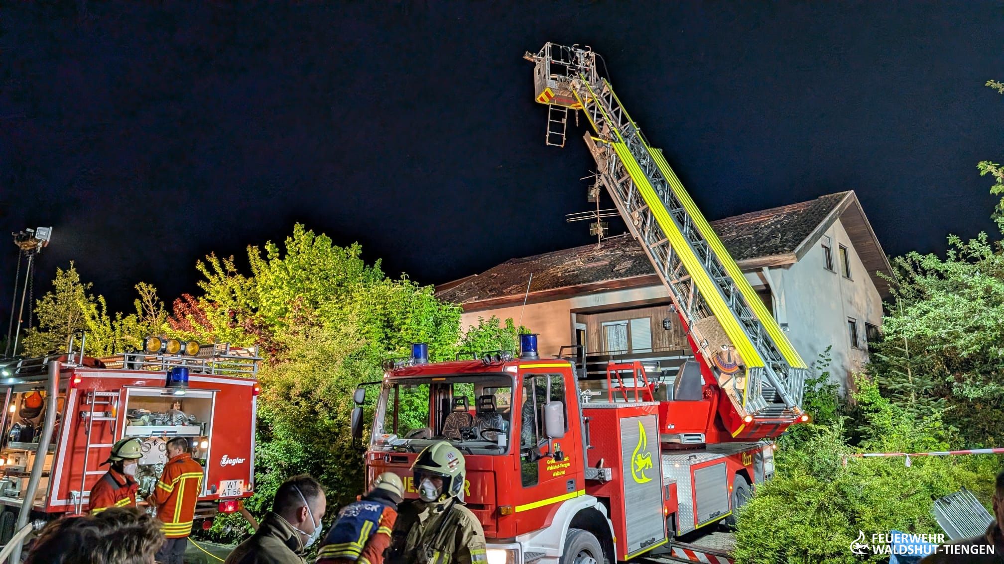 Die Feuerwehr Waldshut-Tiengen war zu einem Dachstuhlbrand mit der Drehleiter und einel Löschfahrzeug in die Gemeinde Albbruck alarmiert worden. Dort istr ein Brand von einer Terrasse auf eine nahestehende Garage und letztlich auch auf den Dachstuhl übergegriffen. Die Löschmaßnahmen wurden von der Drehleiter unterstützt, das Dach wurde geöffnet und Glutnester abgelöscht. Da auch die Wasserversorgung anfangs kritisch war, wurde der SW 2000 Tr, der in der Abteilung Tiengen stationiert ist, ebenfalls alarmiert. Dieser musste nicht mehr eingesetzt werden und konnte früh wieder aus dem Einsatz entlassen werden. Der Einsatzleitwagen der Feuerwehr Waldshut-Tiengen hatte die Einsatzleitung vor Ort in Kommunikation und Dokumentationion unterstützt. Im Einsatz war auch die Drohne des Landkreises Waldshut, welche Luftaufnahmen und Wäremebilder der Einsatzleitung zur Verfügung stellte.