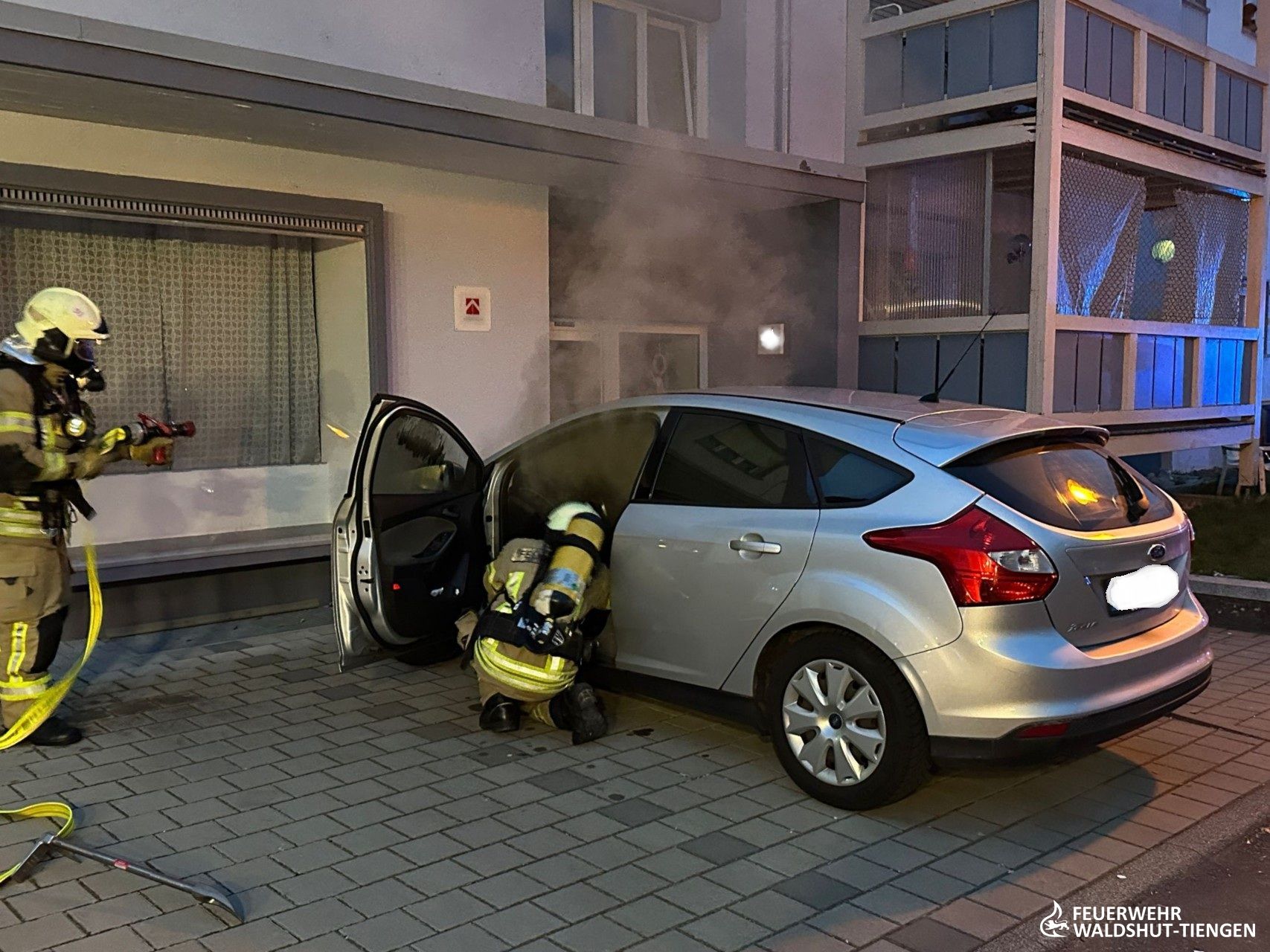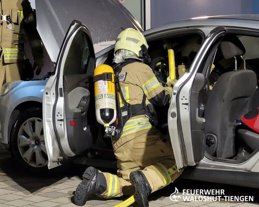 Die Feuerwehrabteilung Waldshut wurde heute Abend zu einem Fahrzeugbrand alarmiert. Es galt einen Entstehungsbrand im Motrorraum abzulöschen. Mittels der Schnellangriffsleitung war der Brand schnell unter Kontrolle gebracht worden. Der Brand hatte sich bereits in das Fahrzeuginnere durch das Armaturenbrett erweitert. Mit einem Wasser-Schaumgemisch hatte man den Brand letztlich vollends abgelöscht.