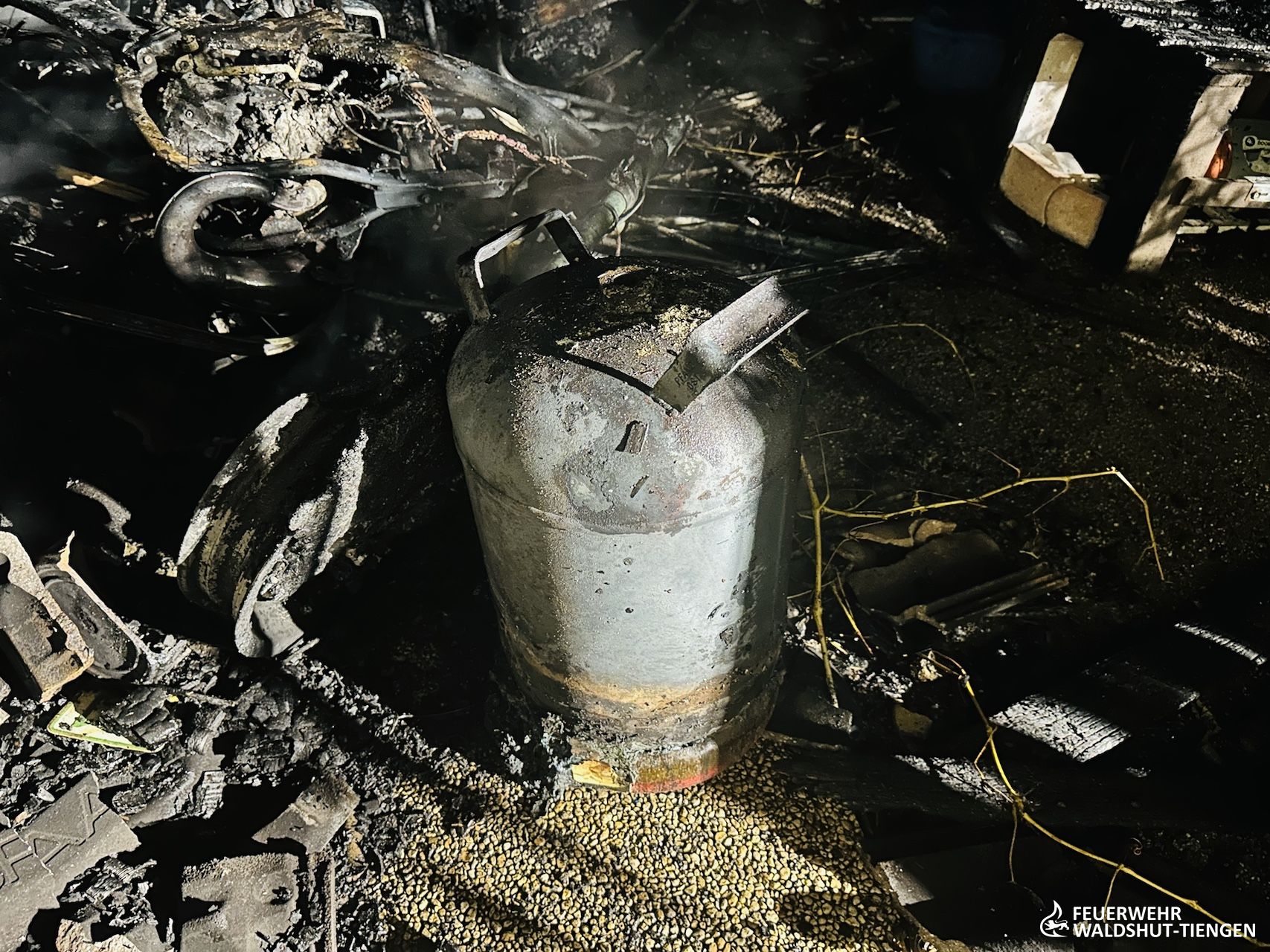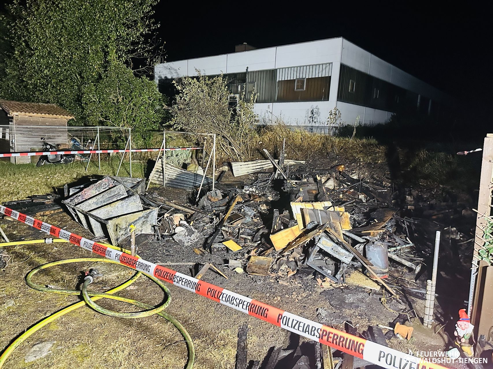 Aus bislang unbekannten Gründen war ein 4m x 4m großer freistehender Schuppen hinter einem Mehrfamilienhaus in Brand geraten. Beim Eintreffen der Feuerwehr stand der Schuppen in Vollbrand. Die Feuerwerhr löschte mit einem Trupp unter umluftunabhängigem Atemschutz und einem C-Hohlstrahlrohr den Brand ab. Das Feuer konnte rasch unter Kontrolle gebracht werden. Letzte Brandnester wurden abgelöscht und der Brandschutt auseinandergezogen. Die Wohnungen des Mehrfamilienhauses wurde kontrolliert, da einige Fenster an dem Gebäude durch das Feuer gesprungen waren. Die Polizei hatte die Ermittlungen aufgenommen.