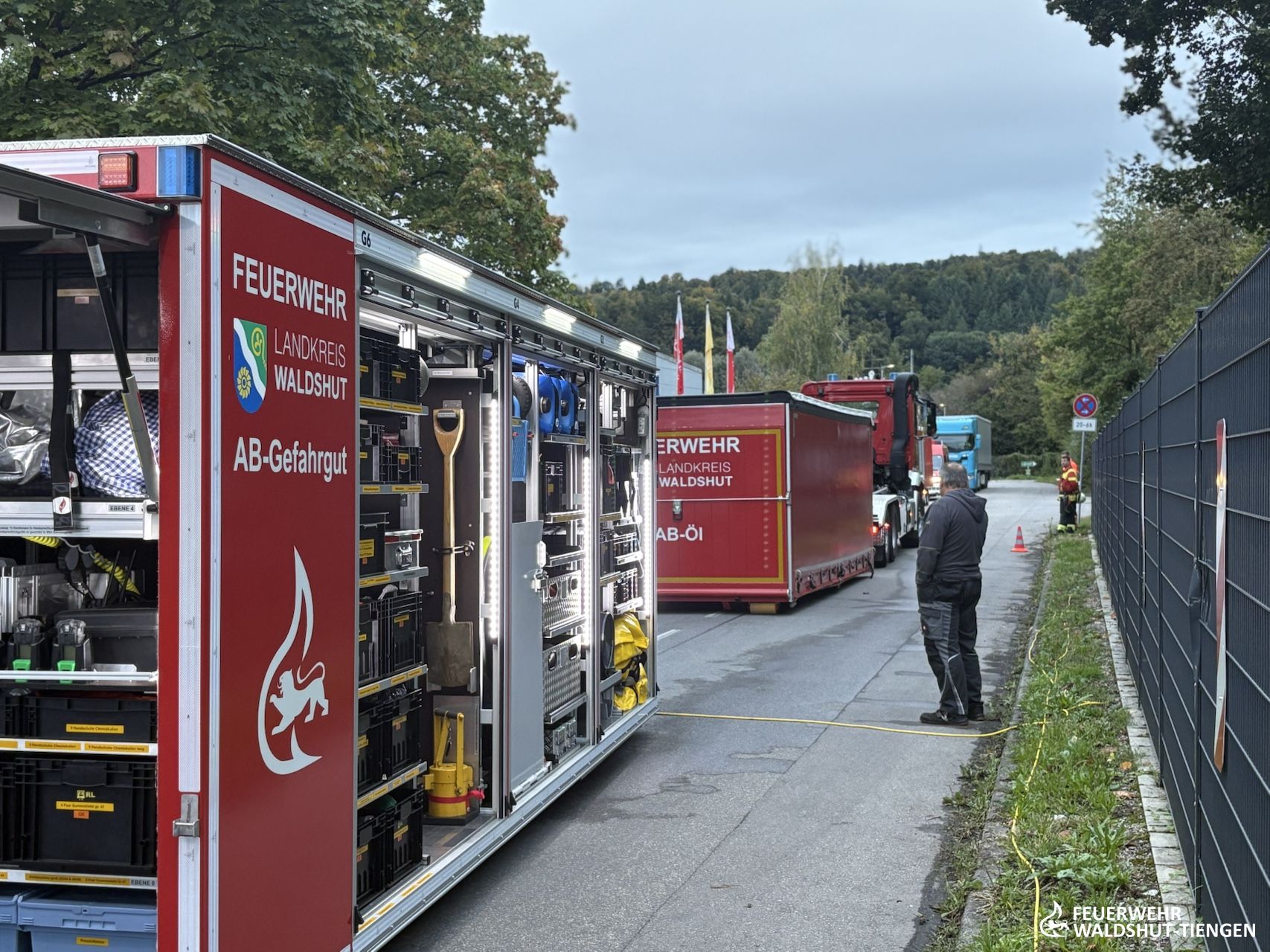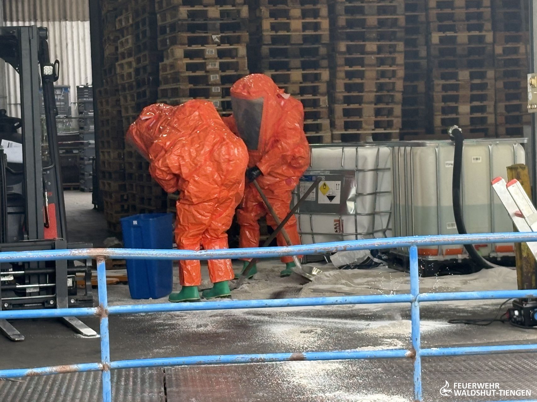 Heute am frühen Morgen wurde der Gefahrstoffzug zu einem Stoffaustritt in einen Gewerbebetrieb in Dogern alarmiert. Ein 1000l Transportbehälter wurde beschädigt und Wasserstoffperoxid trat aus, durch deren Zersetzung war ein Nebel wahrzunehmen. Die Mitarbeiter der Firma reagierten schnell und hatten den Cubitainer auf ein Haveriebock gestellt. Die örtliche Feuerwehr hatten den Gefahrenbereich abgesperrt und war nach dem GAMS-Schema vorgegangen. Menschen waren keine mehr im Gefahrenbereich. Das Wasserstoffperoxid aus dem beschädigte Behälter wurde umgepumpt und die ausgelaufene Flüssigkeit im Gebäude ausgespült und entfernt. Unter Schutzanzügen und umluftunabhängigem Atemschutz hatten die Einsatzkräfte diese Arbeit durchgeführt.
