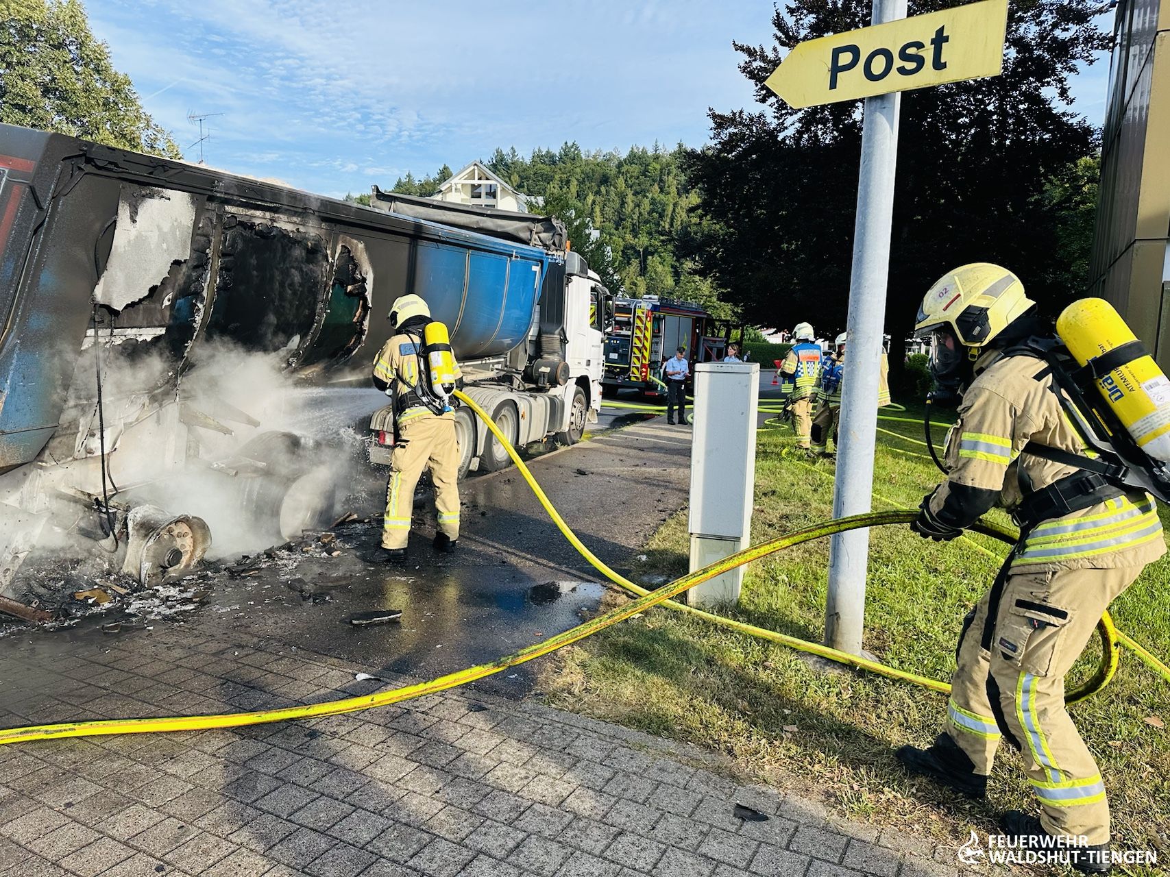 Ein beladener LKW war im Stadtteil Tiengen in Brand geraten. Eine dunkle Rauchsäule hatte den Einsatzkräften schon weit den Einsatzort angezeigt. Beim Eintreffen der Einsatzkräfte brannte der LKW im Bereich der Hinterachsen. Ein Trupp unter umluftunabhängigem Atemschutz hatte mit einem C-Hohlstrahlrohr den Brand rasch unter Kontrolle gebracht und gelöscht. Der Fahrer wurde nicht verletzt, an dem Fahrzeug entstand ein hoher Schaden.