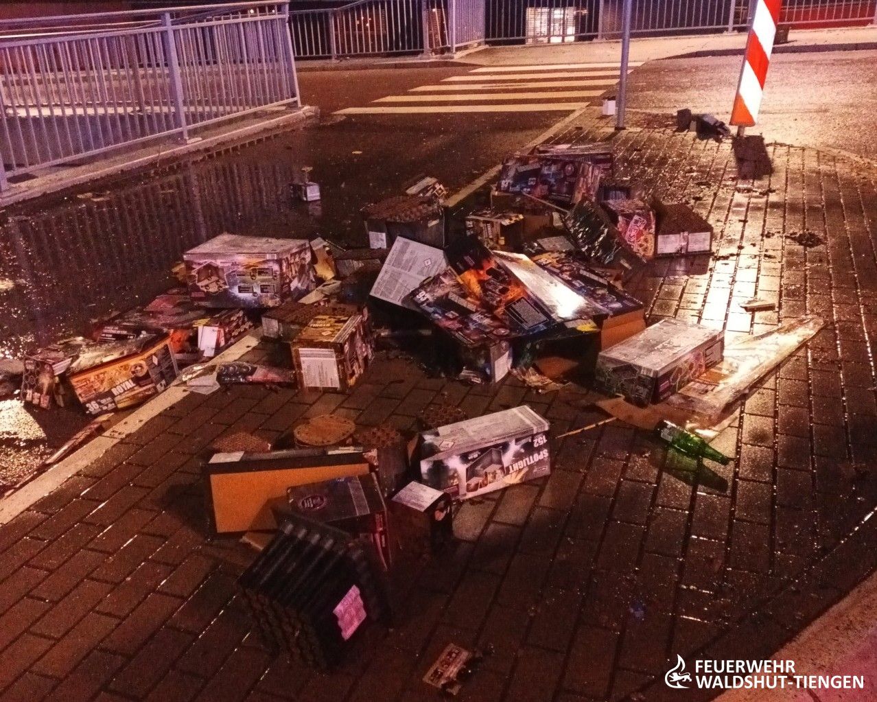 Auch in diesem Jahr waren wieder die Verpackungsreste der Batteriefeuerwerke, welche auf der Kolpingsbrücke abgefeuert und zurückgelassen wurden, in Brand geraten. Die Feuerwehr löschte diese mit einem Schnellangriffsrohr ab und wurden schon zu einem Folgeeinsatz gerufen.
