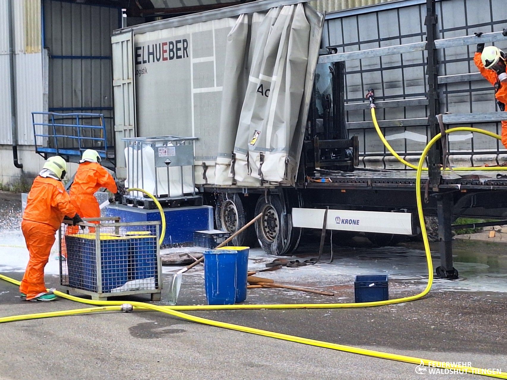 Mehrere Trupps, ausgestattet mit Schutzkleidung der Form 2 und PSA, begannen sofort mit der Identifikation des Stoffes und der Messung der Gefährdung. Durch den Abgleich mit der Ladeliste konnte der Stoff als "Härter, Kauramin 1690" (UN3412) identifiziert werden. Die Messungen ergaben, dass die Konzentrationen in einem Bereich lagen, der keine unmittelbare Gefahr darstellte. Zur Eindämmung des Stoffes wurde Bindemittel eingesetzt. In der Zwischenzeit wurde der Stoff sicher mit Schaufeln und Wasserschiebern aufgenommen, um weitere Kontaminationen zu verhindern. Parallel dazu wurde ein Sicherheitstrupp zur Überwachung und ein Dekontrupp zur Unterstützung der Dekontaminationsmaßnahmen eingesetzt. Zur Minimierung der Gefährdung wurde auch das kontaminierte Gelände gespült und der ausgelaufene Stoff verdünnt.