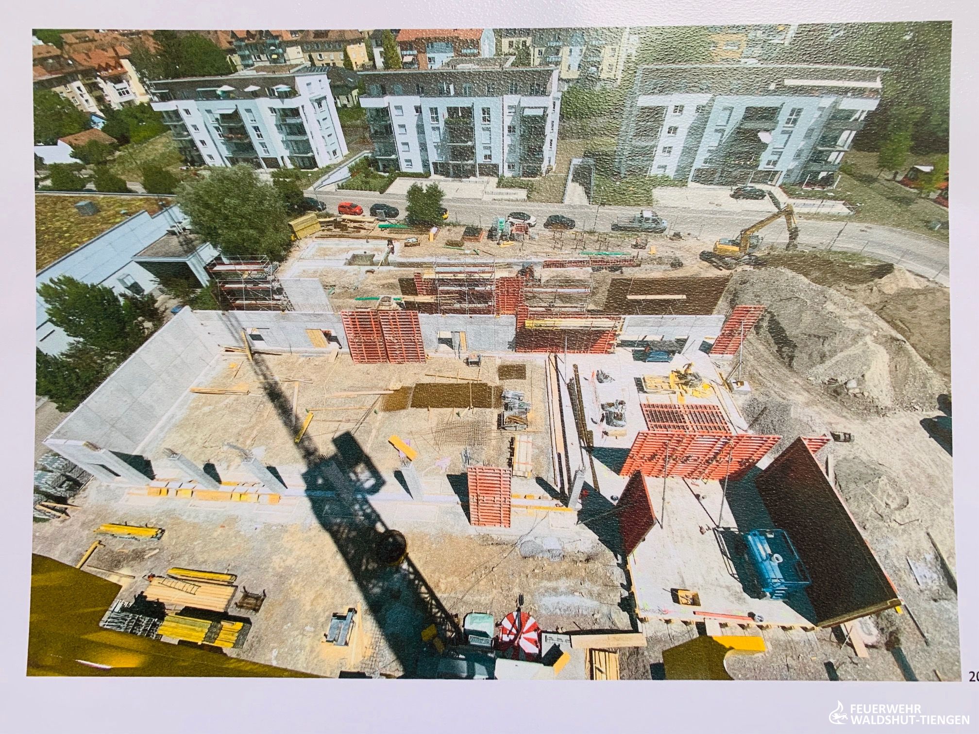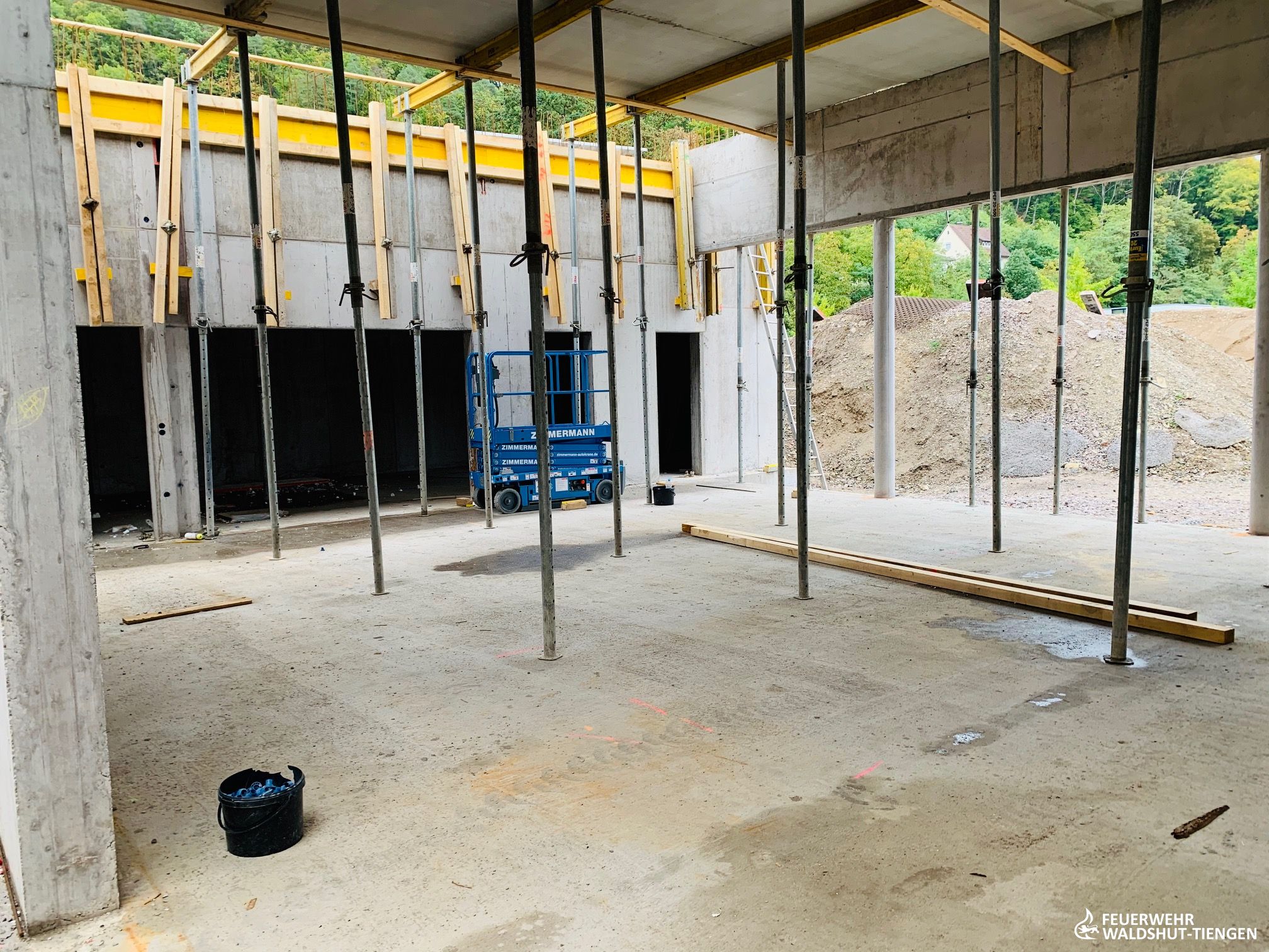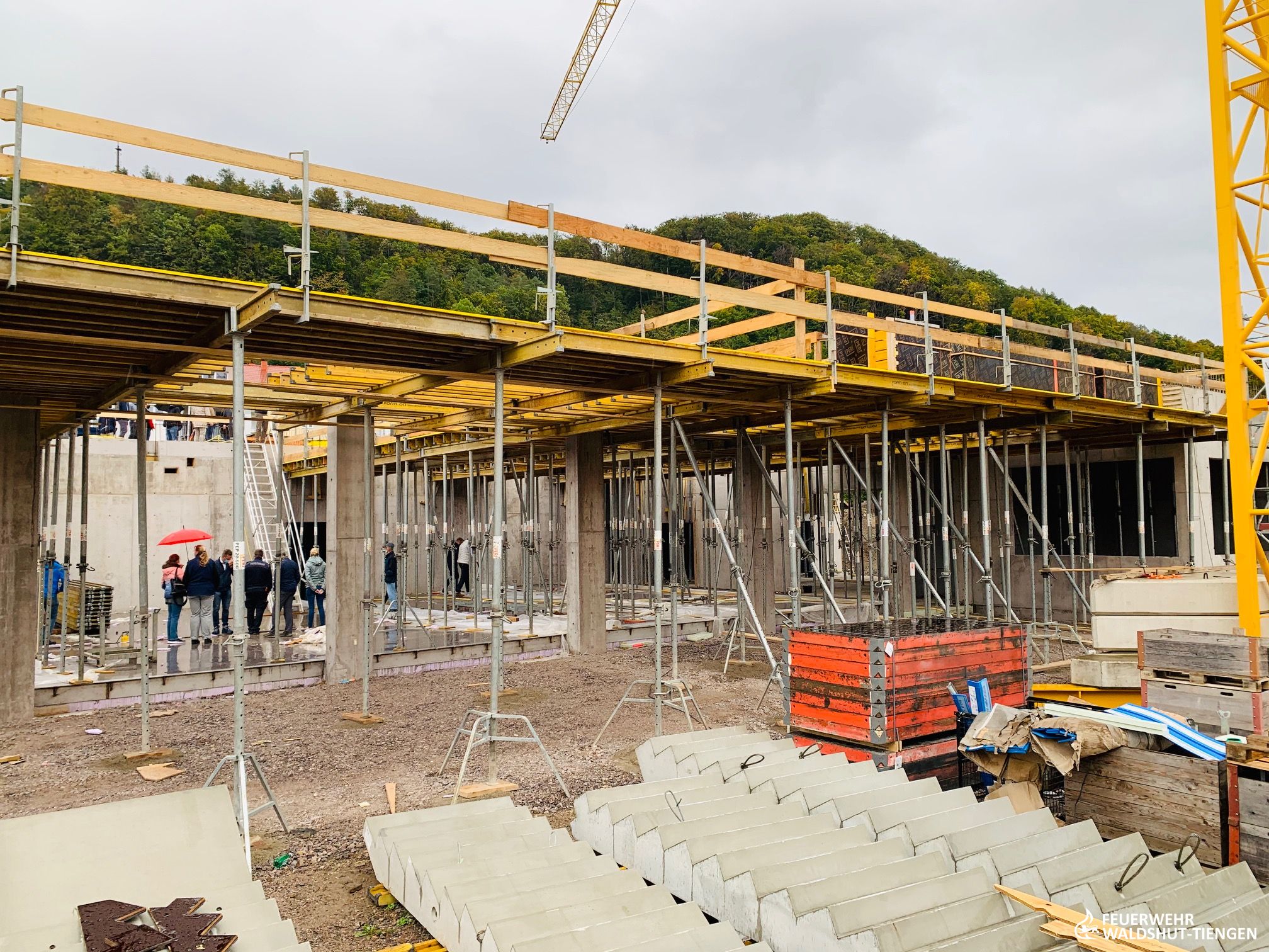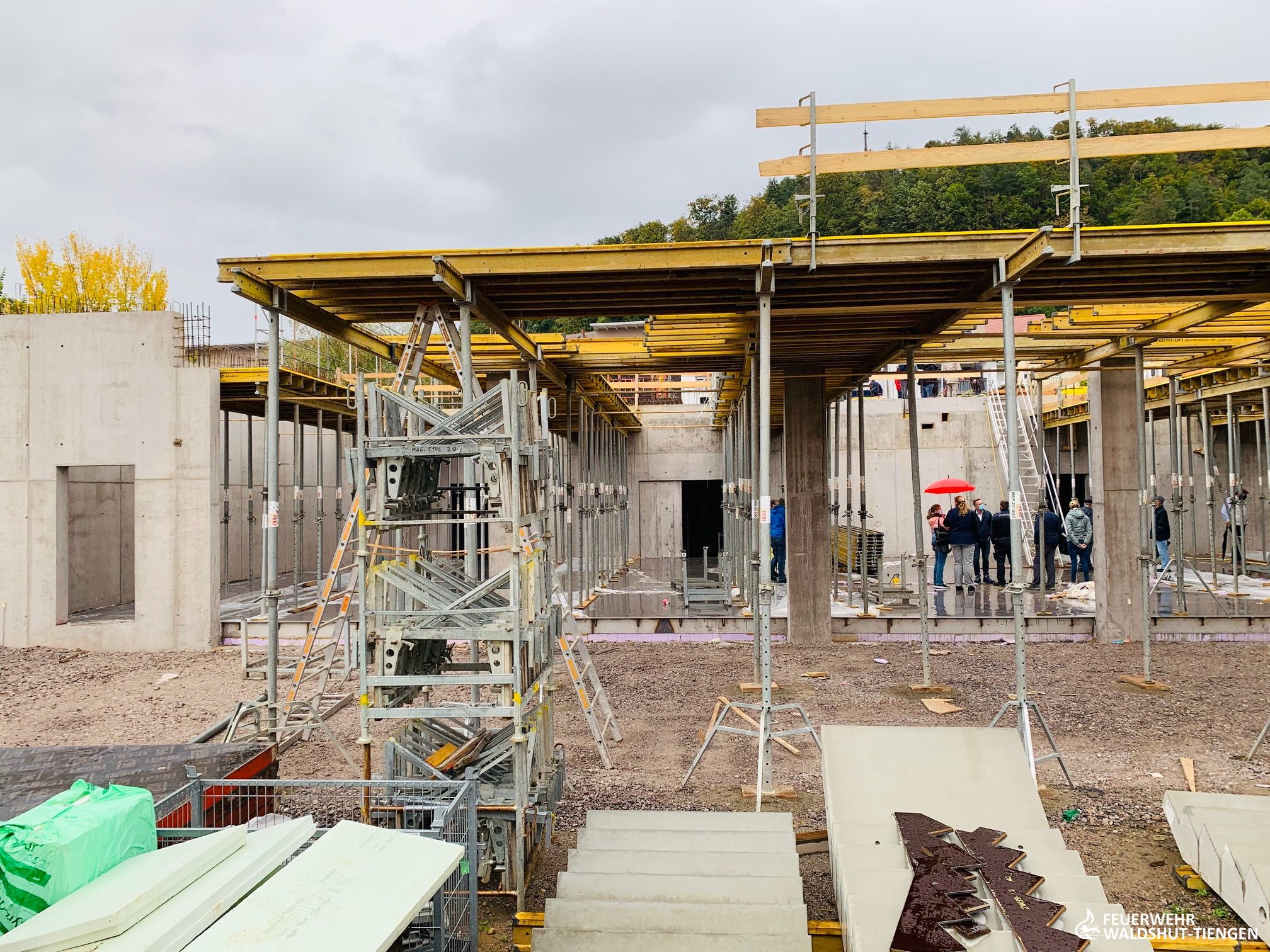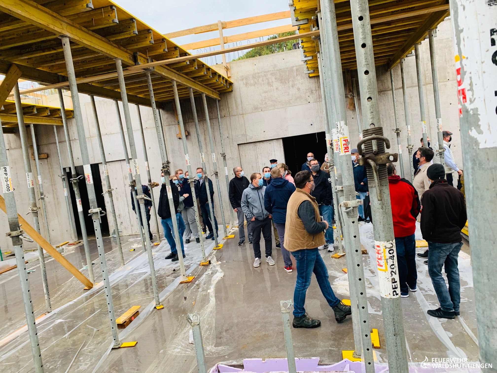 Am vergangenen Montag konnte die Einsatzabteilung Waldshut im Beisein von Oberbürgermeister Dr. Philipp Frank und Bürgermeister Joachim Baumert, dass im Bau befindliche Feuerwehrgerätehaus mit Kindertagesstätte besichtigen. Der Bauleiter und eine Architektin des Büros bächlemaid, hatten den anwesenden Kammeraden die entstehenden Räumlichkeiten vorgestellt und standen für weitere Fragen zur Verfügung. Das Gerätehaus wird mit sechs Stellplätzen ausreichend Platz für den Löschzug der Abteilung Waldshut bieten. Neben der Funkzentrale wird ein Besprechungsraum entstehen, der in unmittelbarer Nähe zum Schulungsraum steht, der auch dem Musikzug für seine Proben zur Verfügung stehen wird.
