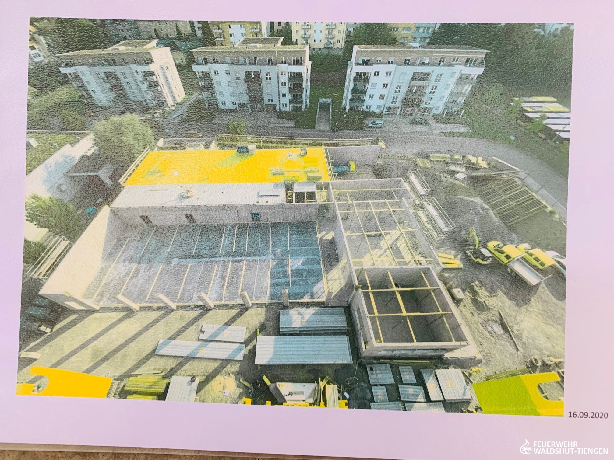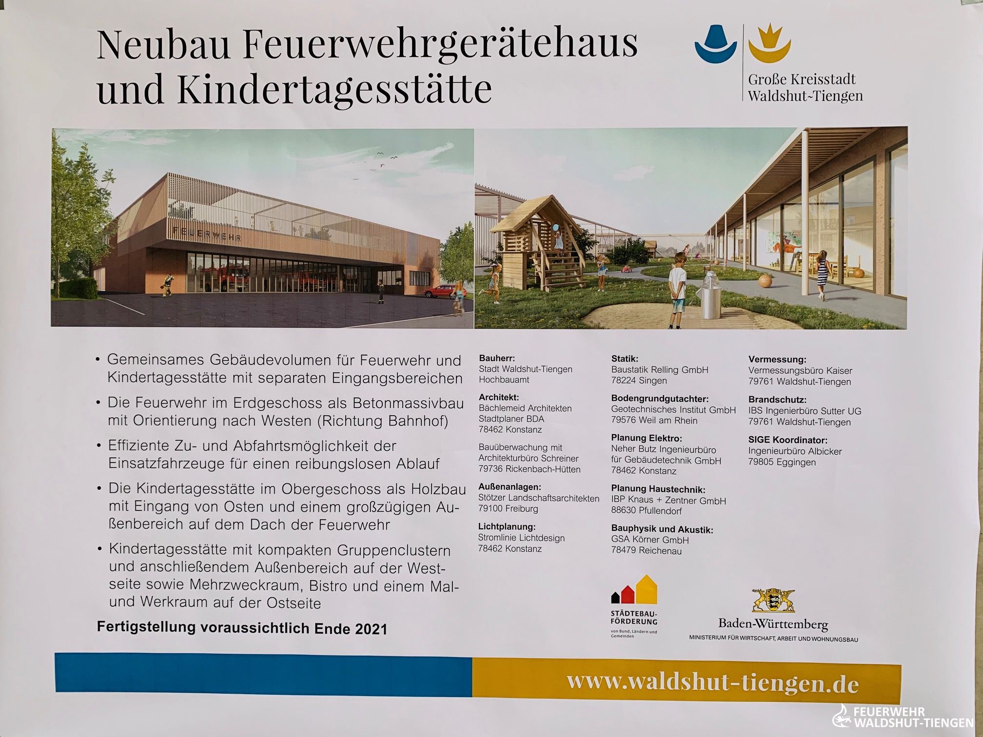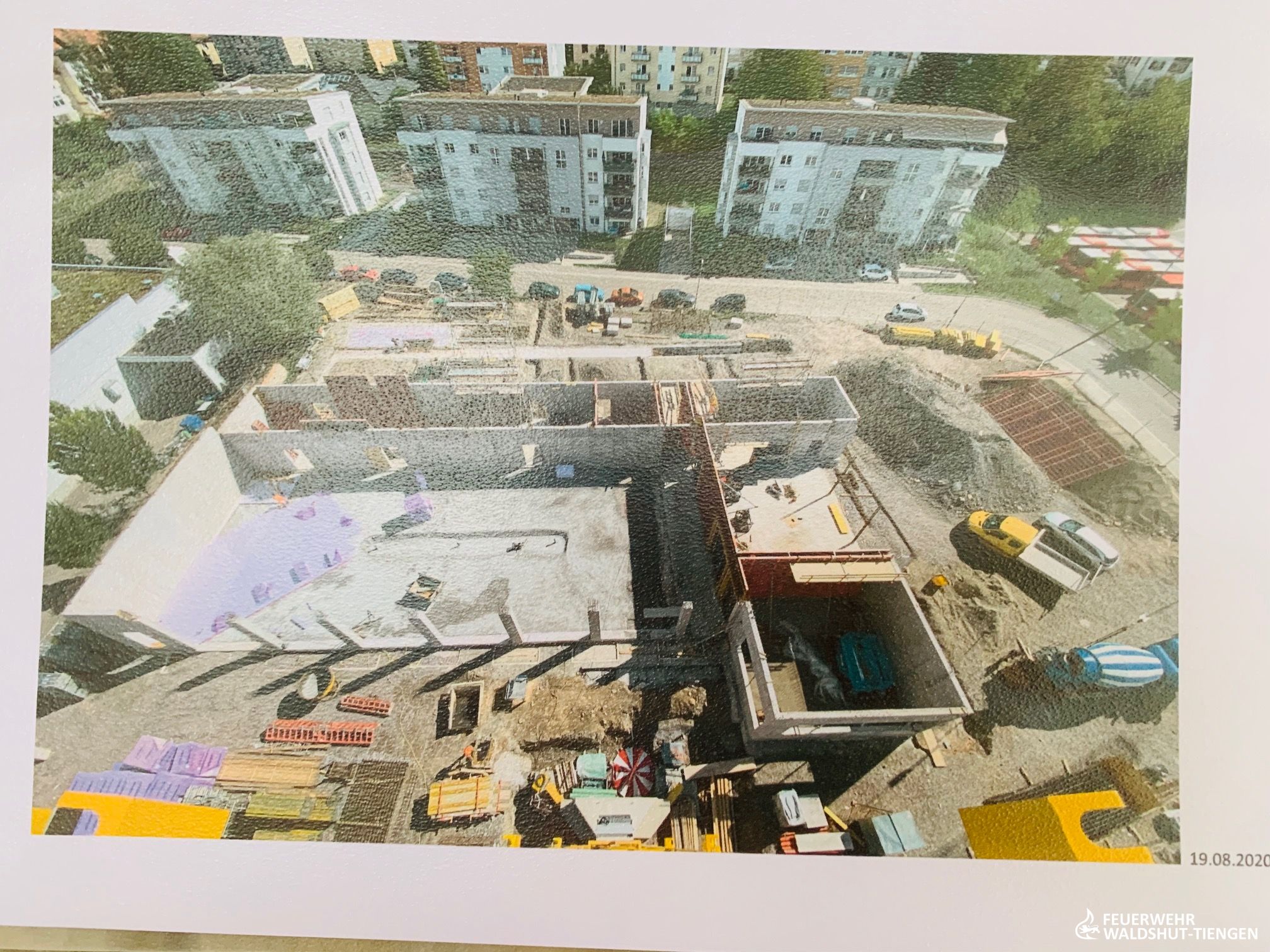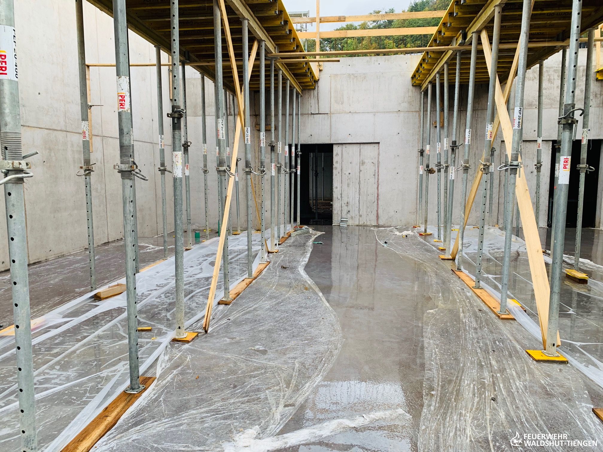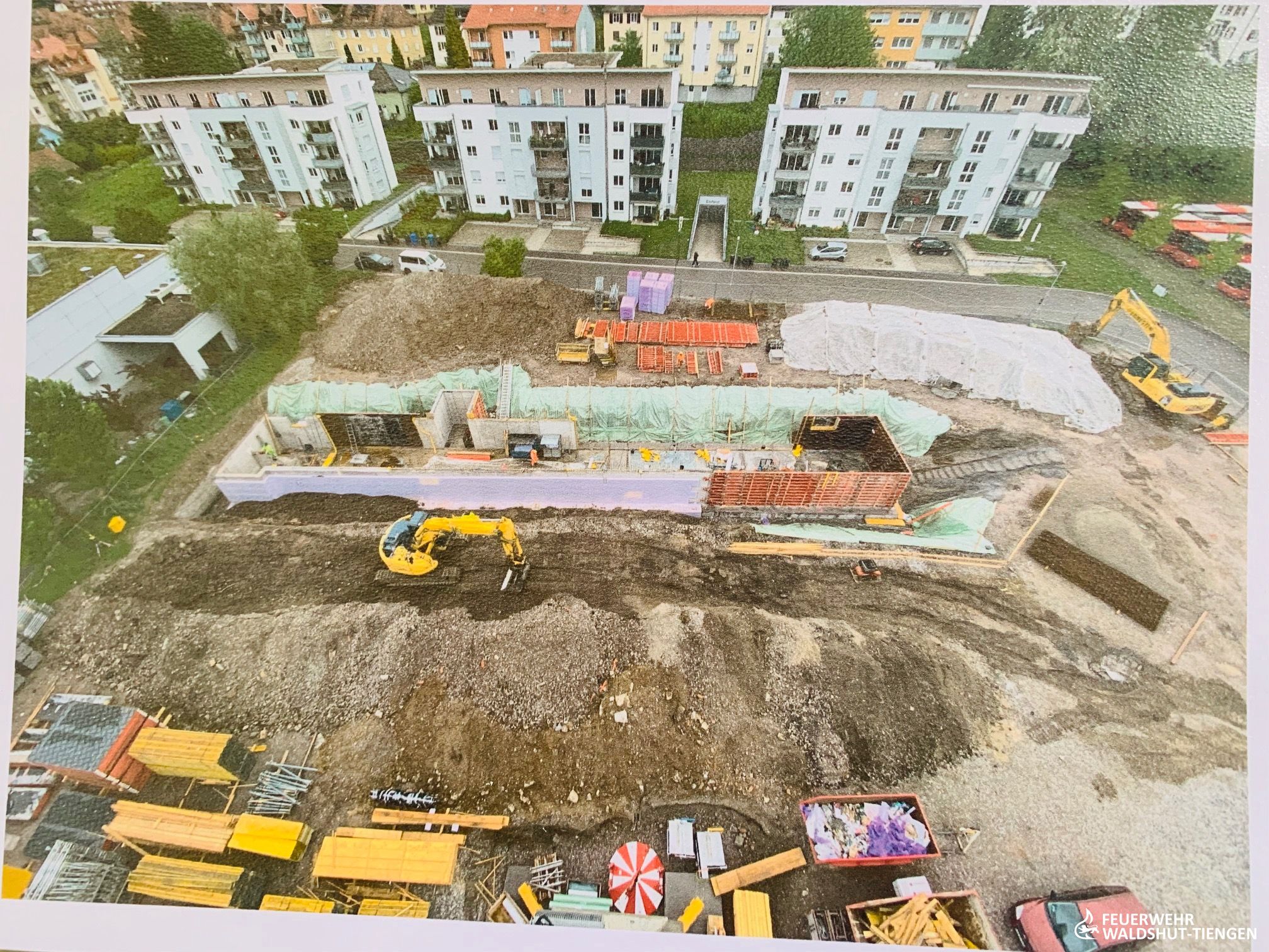 Am vergangenen Montag konnte die Einsatzabteilung Waldshut im Beisein von Oberbürgermeister Dr. Philipp Frank und Bürgermeister Joachim Baumert, dass im Bau befindliche Feuerwehrgerätehaus mit Kindertagesstätte besichtigen. Der Bauleiter und eine Architektin des Büros bächlemaid, hatten den anwesenden Kammeraden die entstehenden Räumlichkeiten vorgestellt und standen für weitere Fragen zur Verfügung. Das Gerätehaus wird mit sechs Stellplätzen ausreichend Platz für den Löschzug der Abteilung Waldshut bieten. Neben der Funkzentrale wird ein Besprechungsraum entstehen, der in unmittelbarer Nähe zum Schulungsraum steht, der auch dem Musikzug für seine Proben zur Verfügung stehen wird.