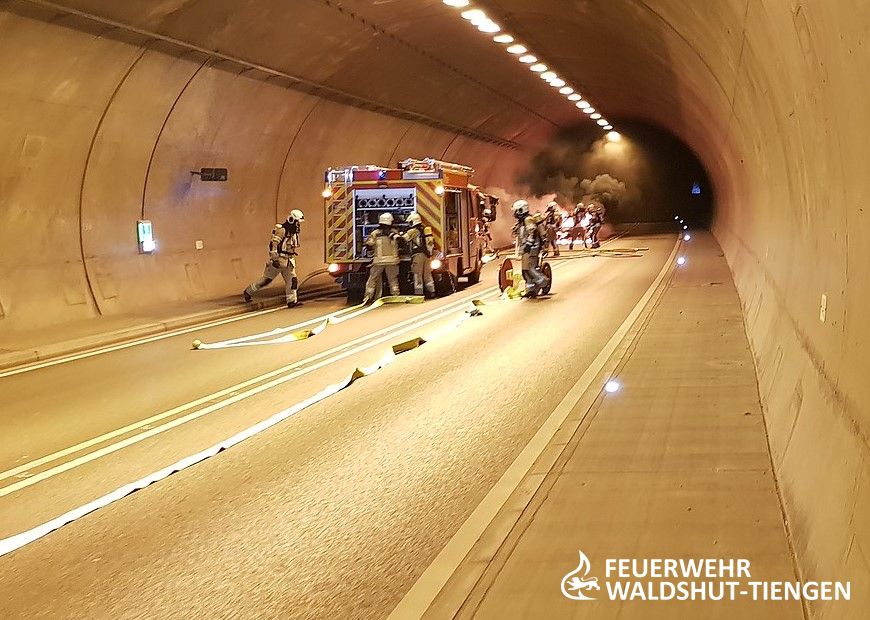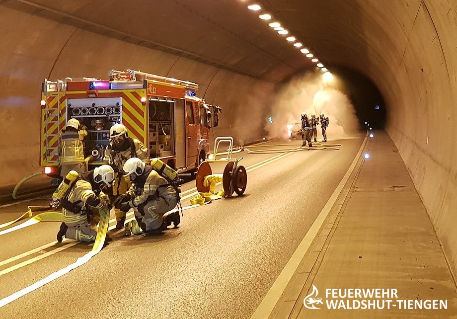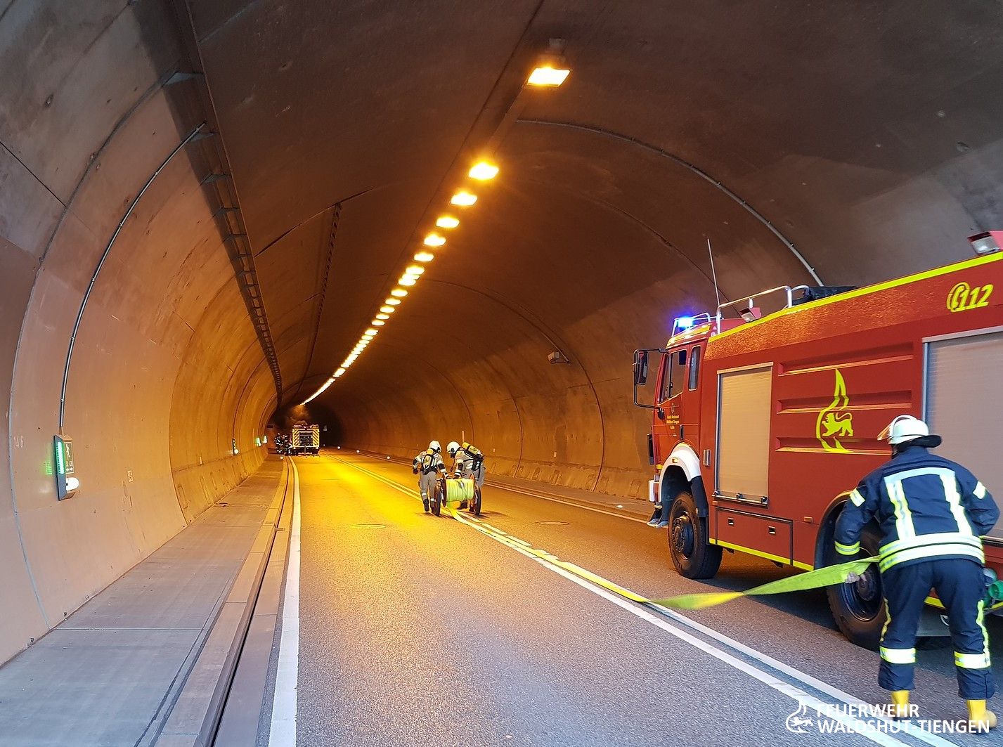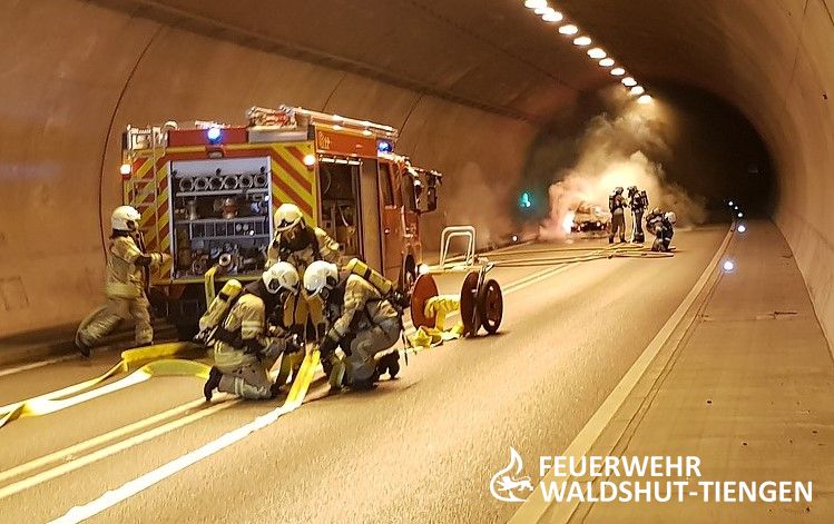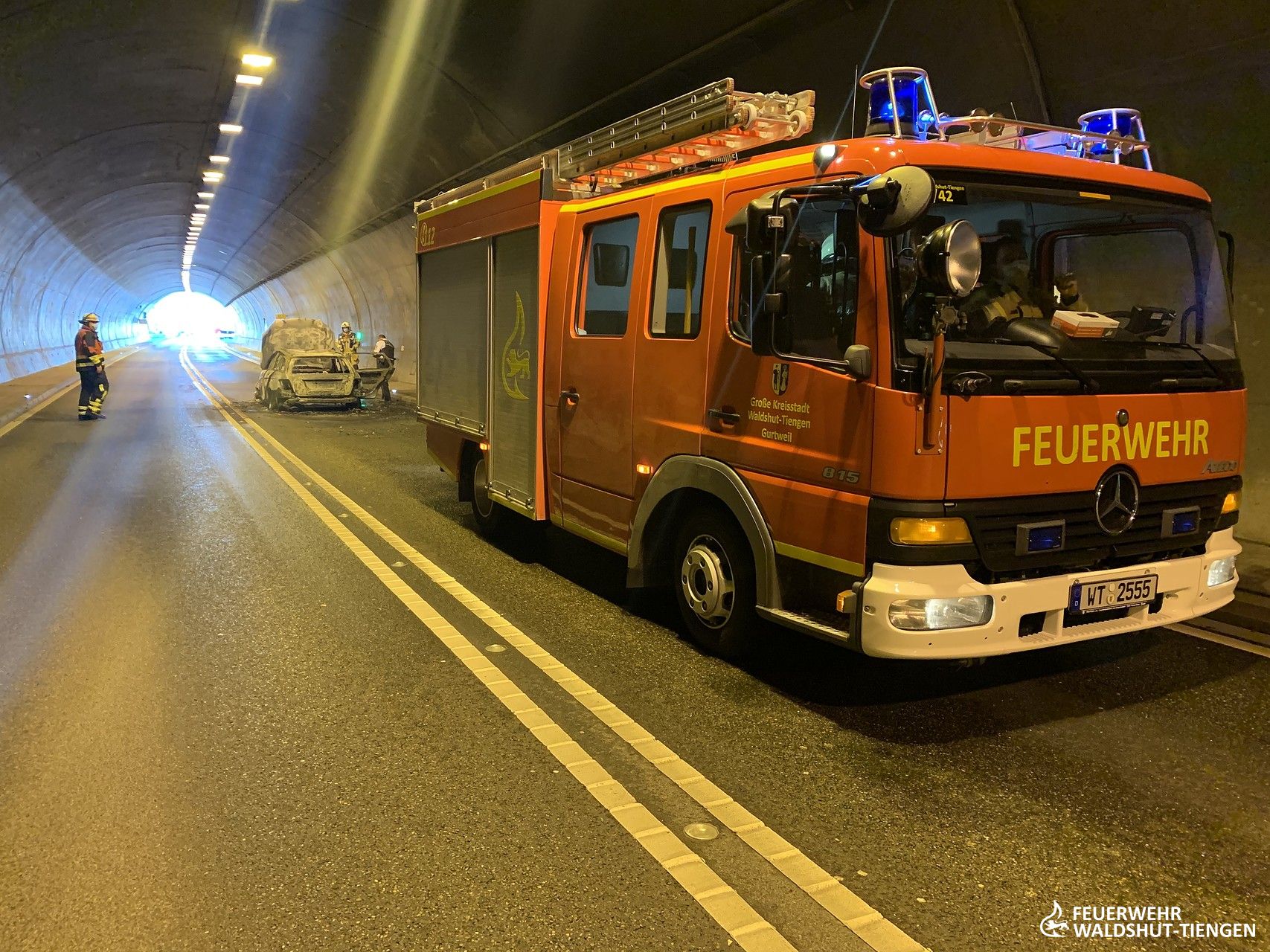 Um kurz nach 8 Uhr am Dienstagmorgen hatte uns eine Alarmierung in den Bürgerwalttunnel erreicht. Ein PKW im Tunnel, ca. 100m vor der Ausfahrt West, stand aus bislang ungeklärten Gründen in Flammen. Die Integrierte Leitstelle hatte die Feuerwehr Waldshut-Tiengen sowie Kräfte der Feuerwehr Lauchringen, Wutöschingen, Küssaberg und Dogern alarmiert.