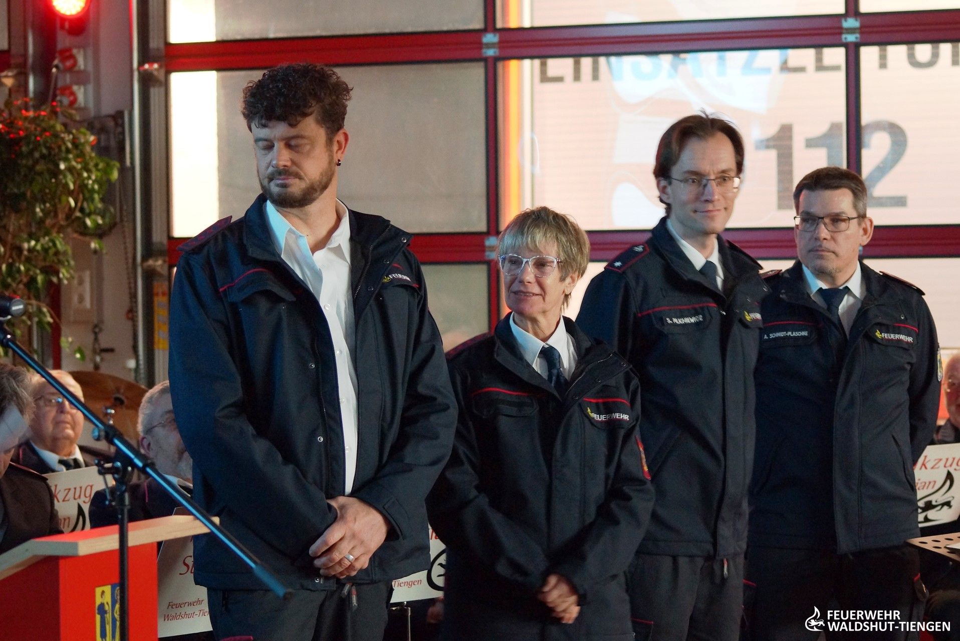 Für 15 Jahre aktiven Feuerwehrdienst und somit mit dem Feuerwehr-Ehrenzeichen in Bronze, wurde Fabian Nadolny geehrt. Bereits 25 Jahre lang waren Heiko Hug, Christiane Matzke, Stephan Pilichiewicz und Andreas Schmidt-Plaschke aktiv im Feuerwehrdienst und mit dem Feuerwehr-Ehrenzeichen in Silber geehrt. Thomas Maier erhielt für seine 40jährige aktive Mitgliedschaft das Ehrenzeichen in Gold. Schließlich wurden noch Peter Gantner, der Leiter der Höhenrettungsgruppe, geehrt. Er erhielt für seine Verdienste um die Gründung und den Aufbau, sowie die stetige Ausbildung der Höhenrettungsgruppe die Ehrenmedaille in Silber des Landesfeuerwehrverbandes Baden-Württemberg. Diese wurde von Andreas Denoke, dem stv. Vorsitzenden des Kreisfeuerwehrverband, überreicht.
