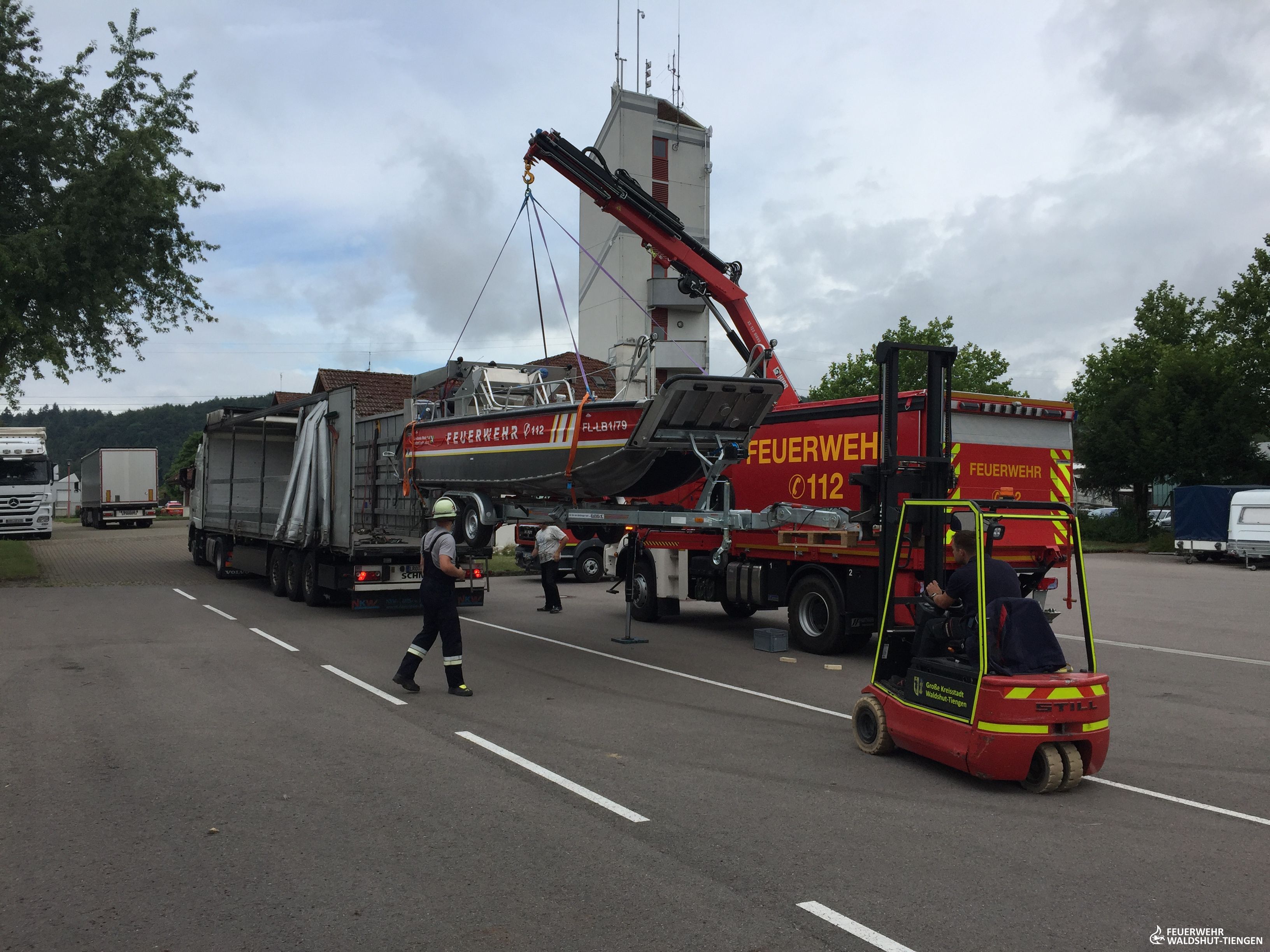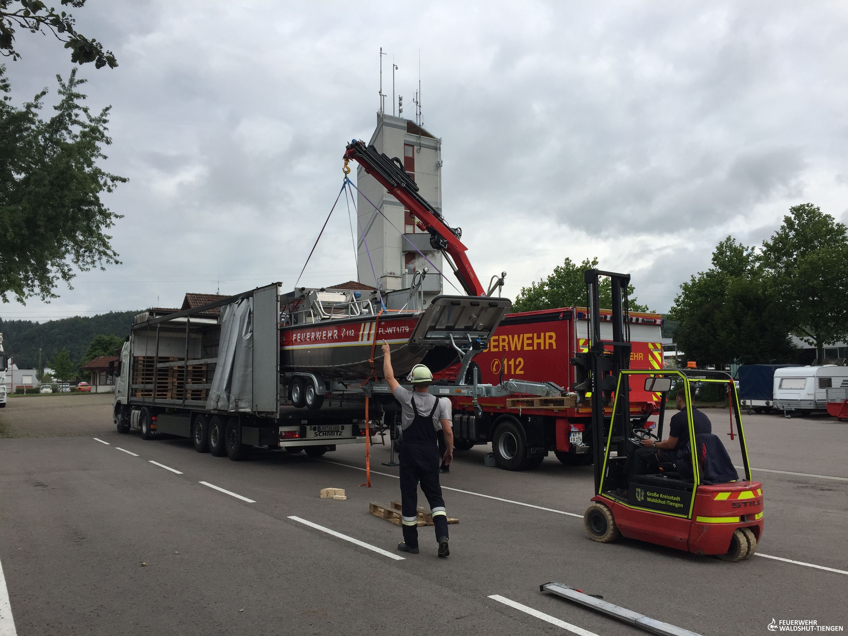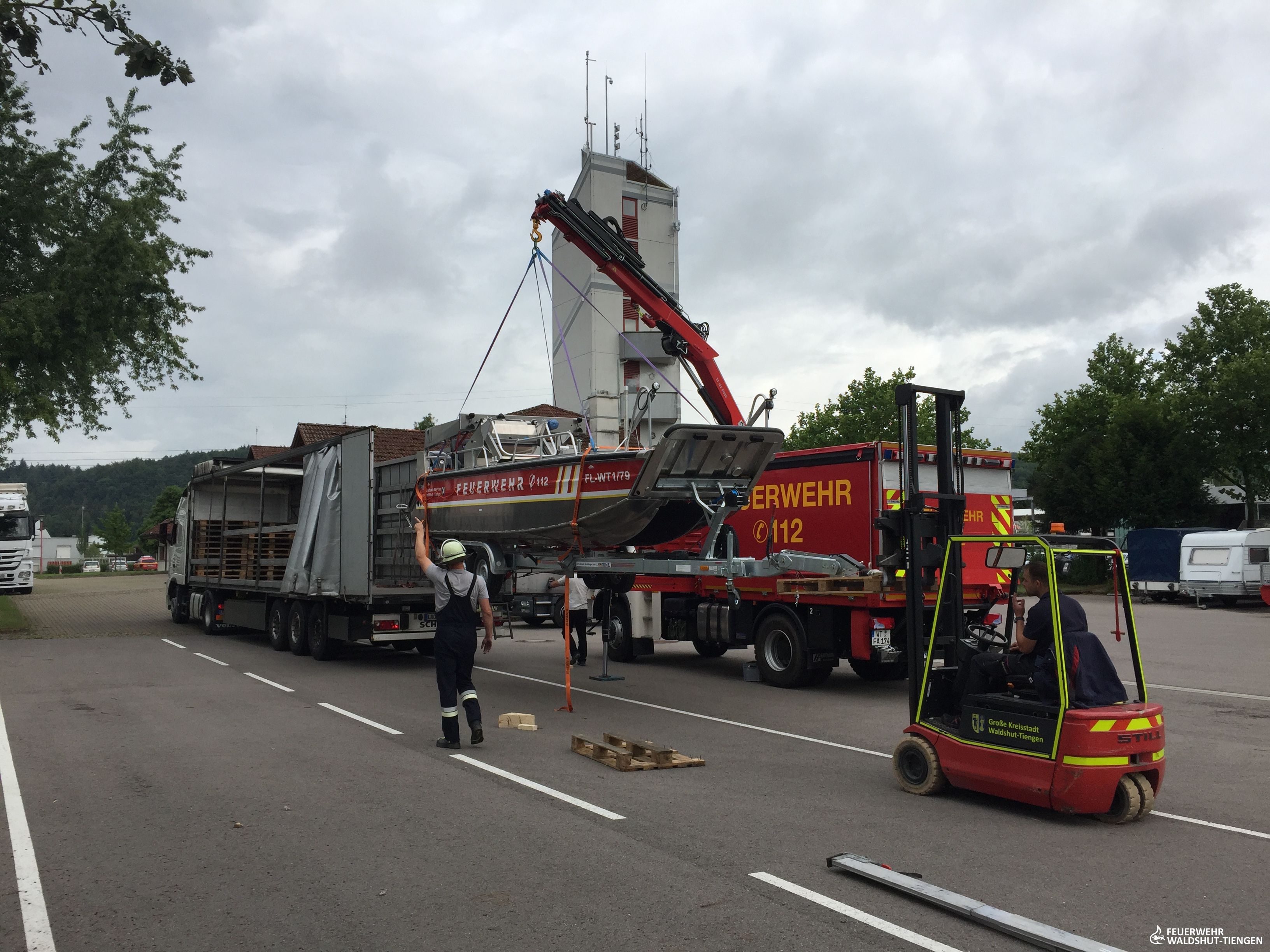 Am Dienstag den 11.07.2017 wurde unser neues Feuerwehrboot zusammen mit den übrigen drei neuen Feuerwehrbooten des Landkreises durch eine Spedition angeliefert. Drei Sattelzüge waren nötig, um die vier Boote von der Werft in Rostock nach Waldshut-Tiengen zu transportieren. In Zusammenarbeit mit der Feuerwehr Albbruck wurden die Feuerwehrboote mittels Kran von den Sattelzügen entladen.