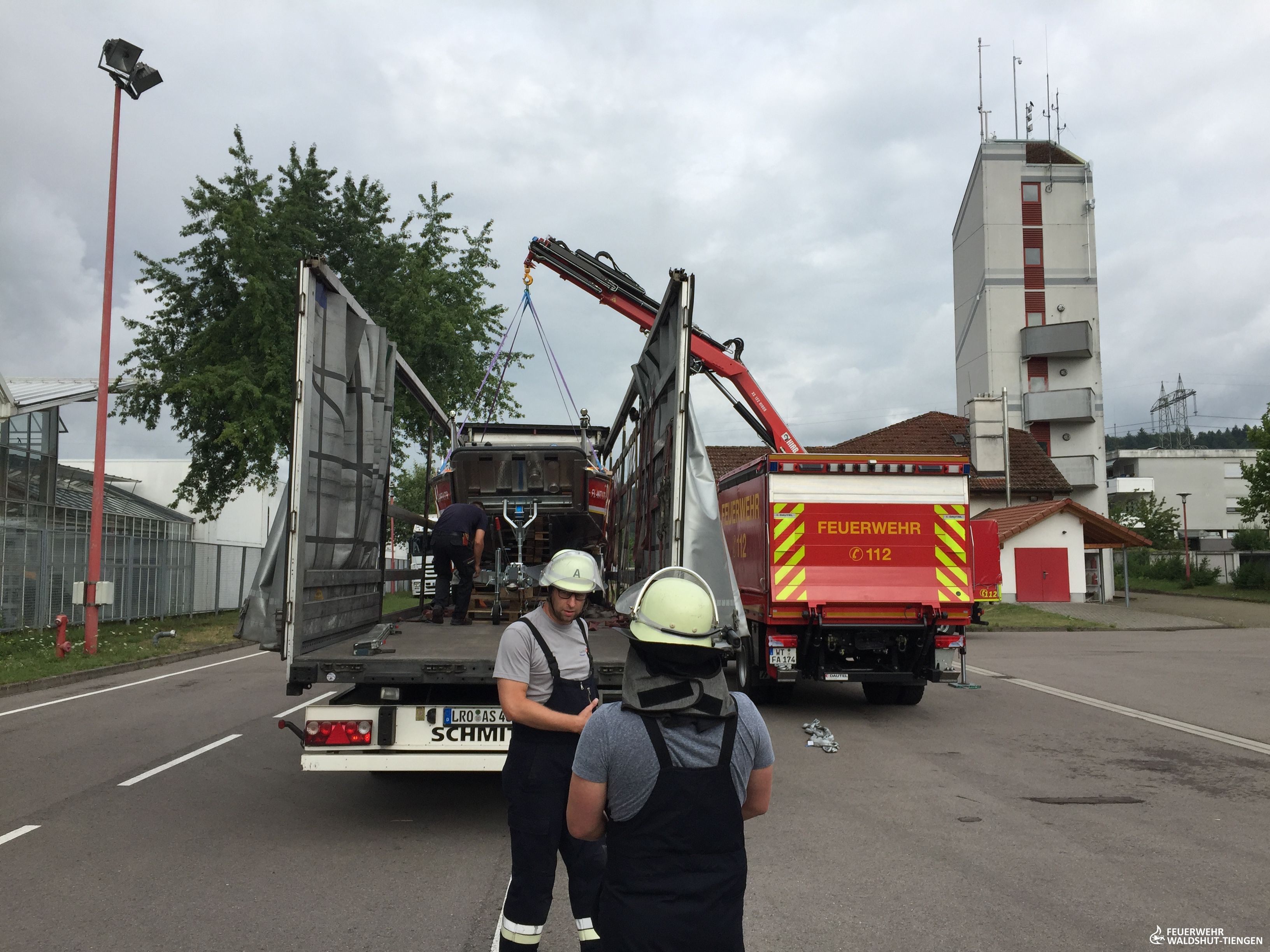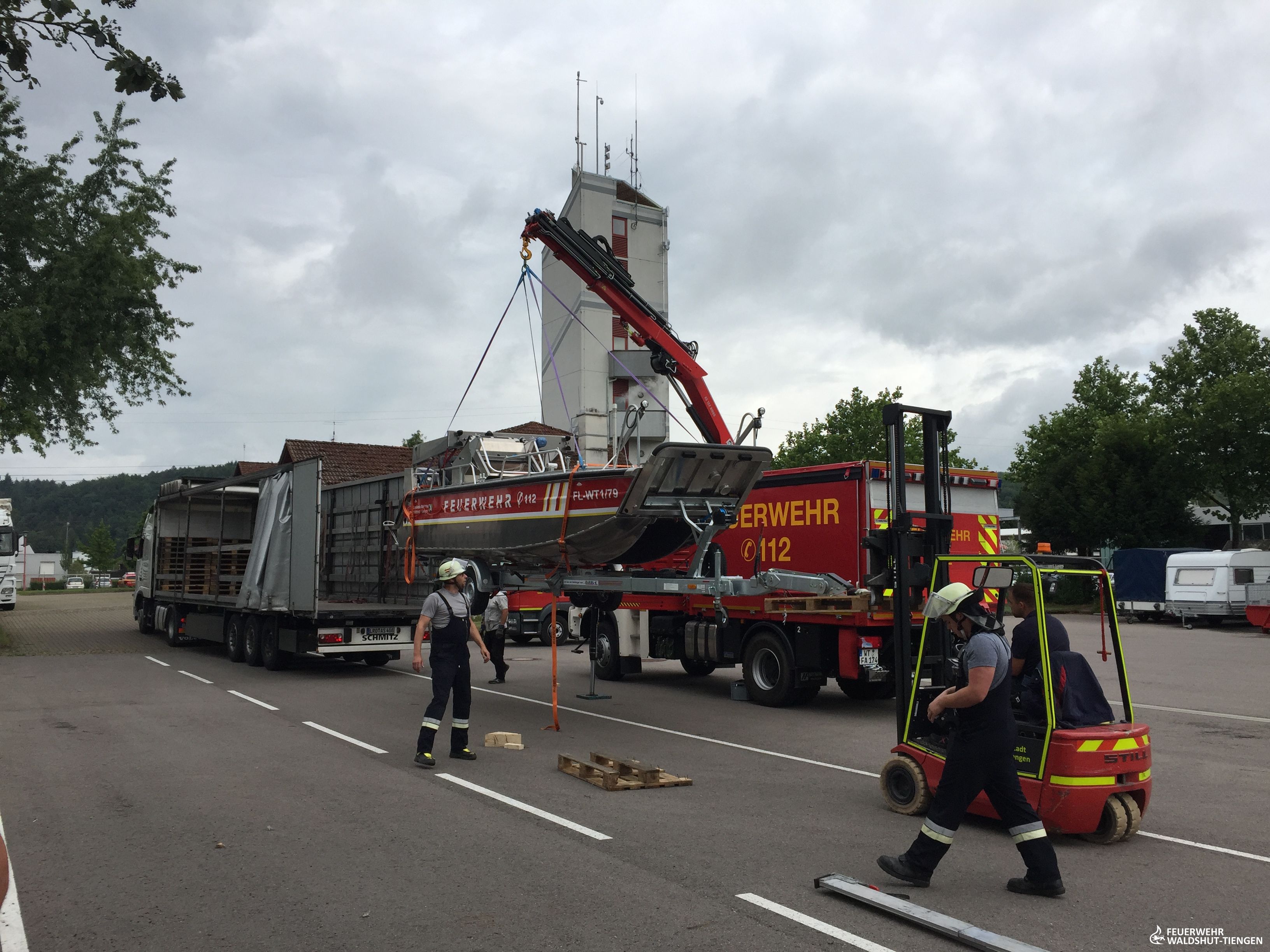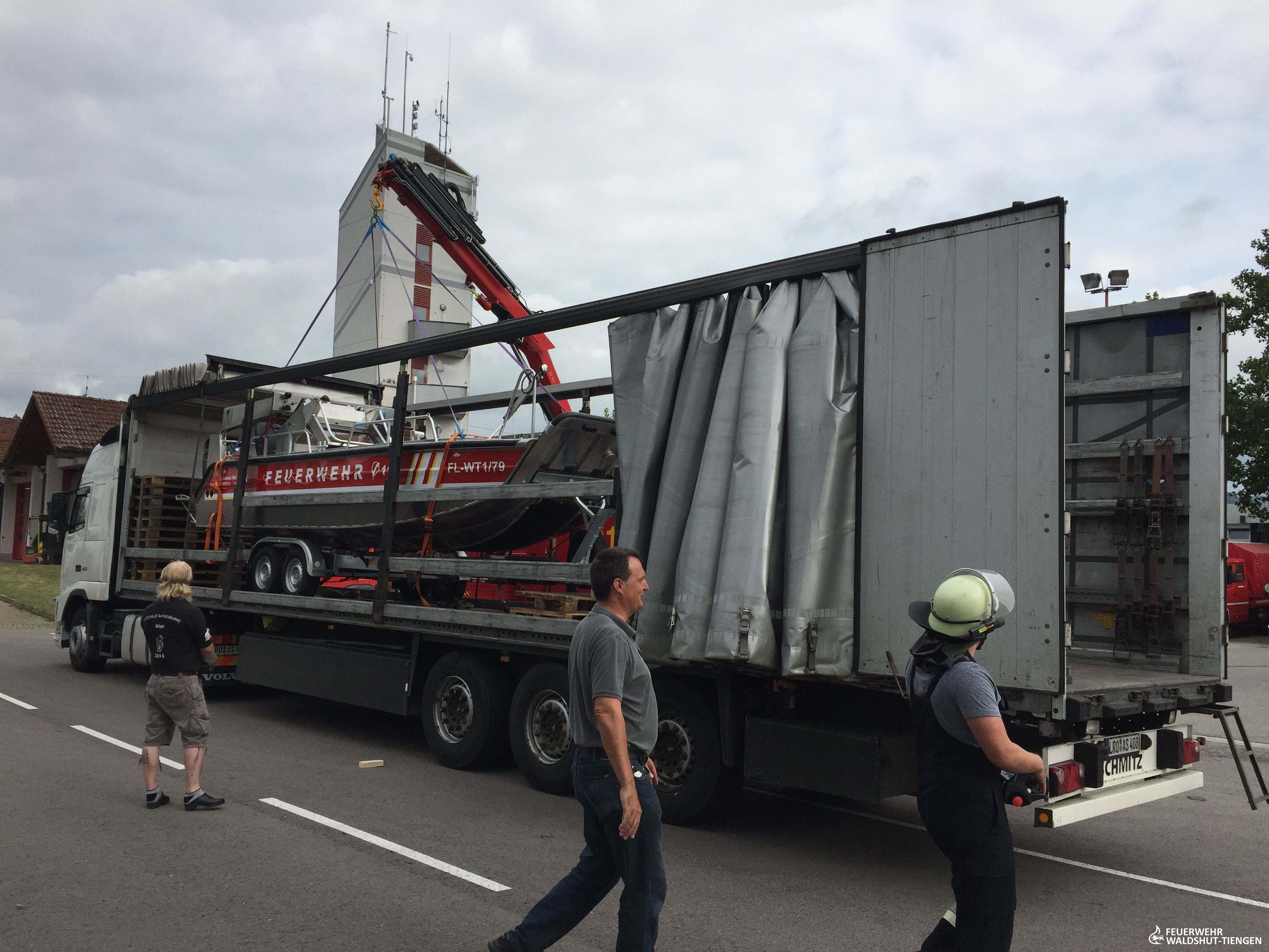 Am Dienstag den 11.07.2017 wurde unser neues Feuerwehrboot zusammen mit den übrigen drei neuen Feuerwehrbooten des Landkreises durch eine Spedition angeliefert. Drei Sattelzüge waren nötig, um die vier Boote von der Werft in Rostock nach Waldshut-Tiengen zu transportieren. In Zusammenarbeit mit der Feuerwehr Albbruck wurden die Feuerwehrboote mittels Kran von den Sattelzügen entladen.
