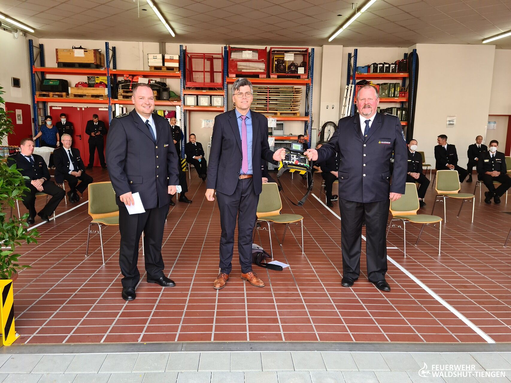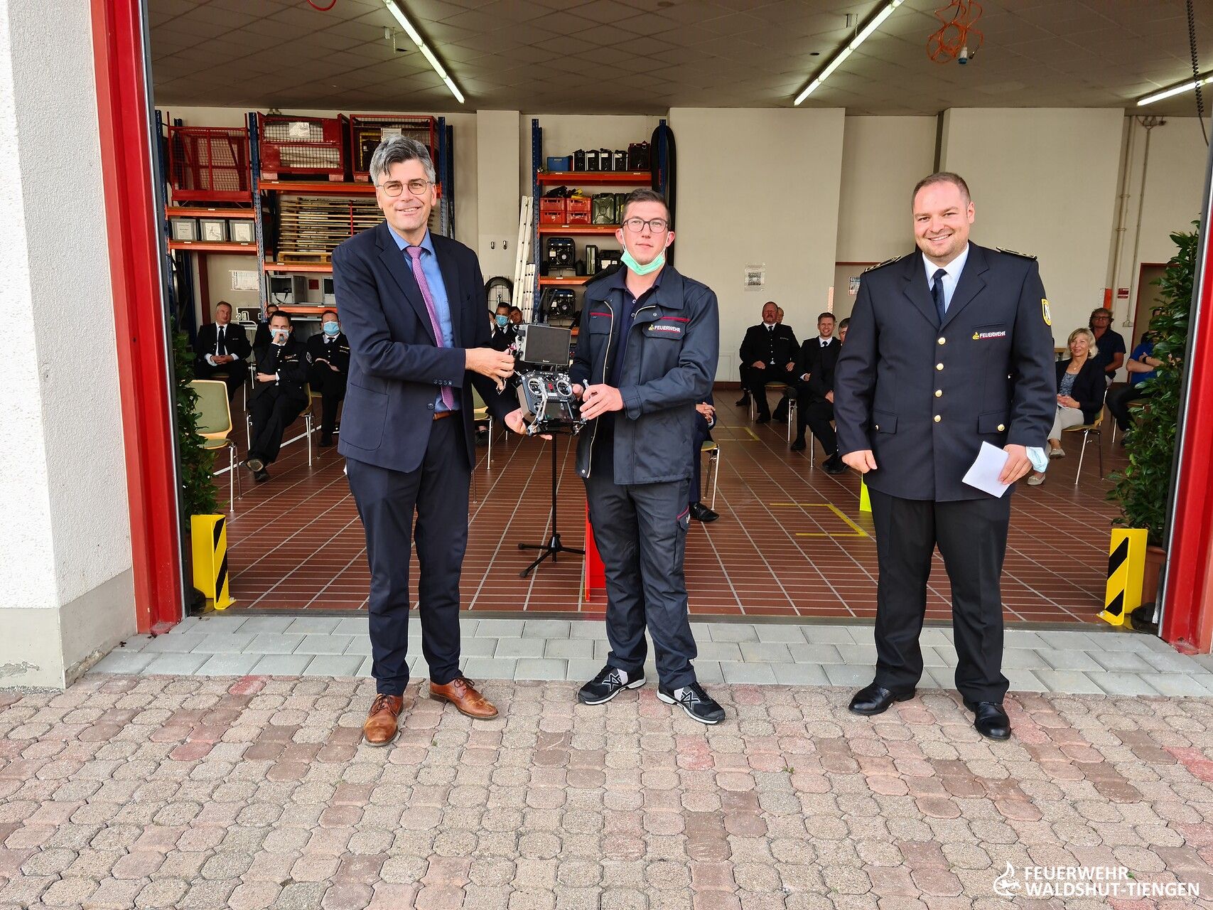 Kreisbrandmeister Dominik Rotzinger erläuterte in seinem Grußwort, wo und wie die Anschaffungen im Feuerwehralltag zum Einsatz finden. Bereits haben Bewährungsproben stattgefunden und das Gerät hat sich bestens bewährt. Die Feuerwehren haben sich in der Corona-Pandemie in Kleingruppen mit dem neuen Gerät vertraut gemacht. Das weitere Anschaffungen folgen müssen und werden hat letztlich auch die Kathastrophe in Rheinland Pfalz wieder gezeigt.