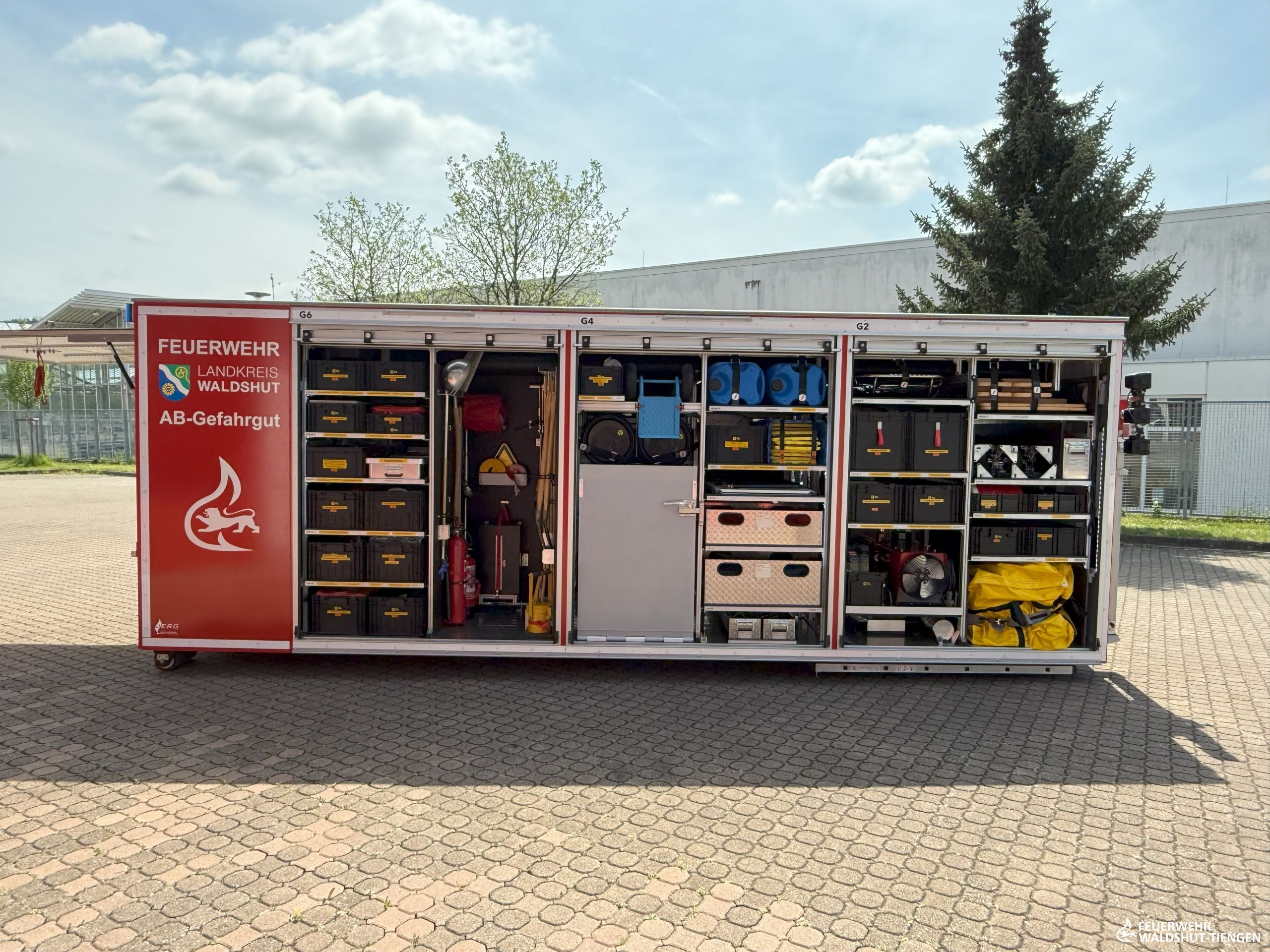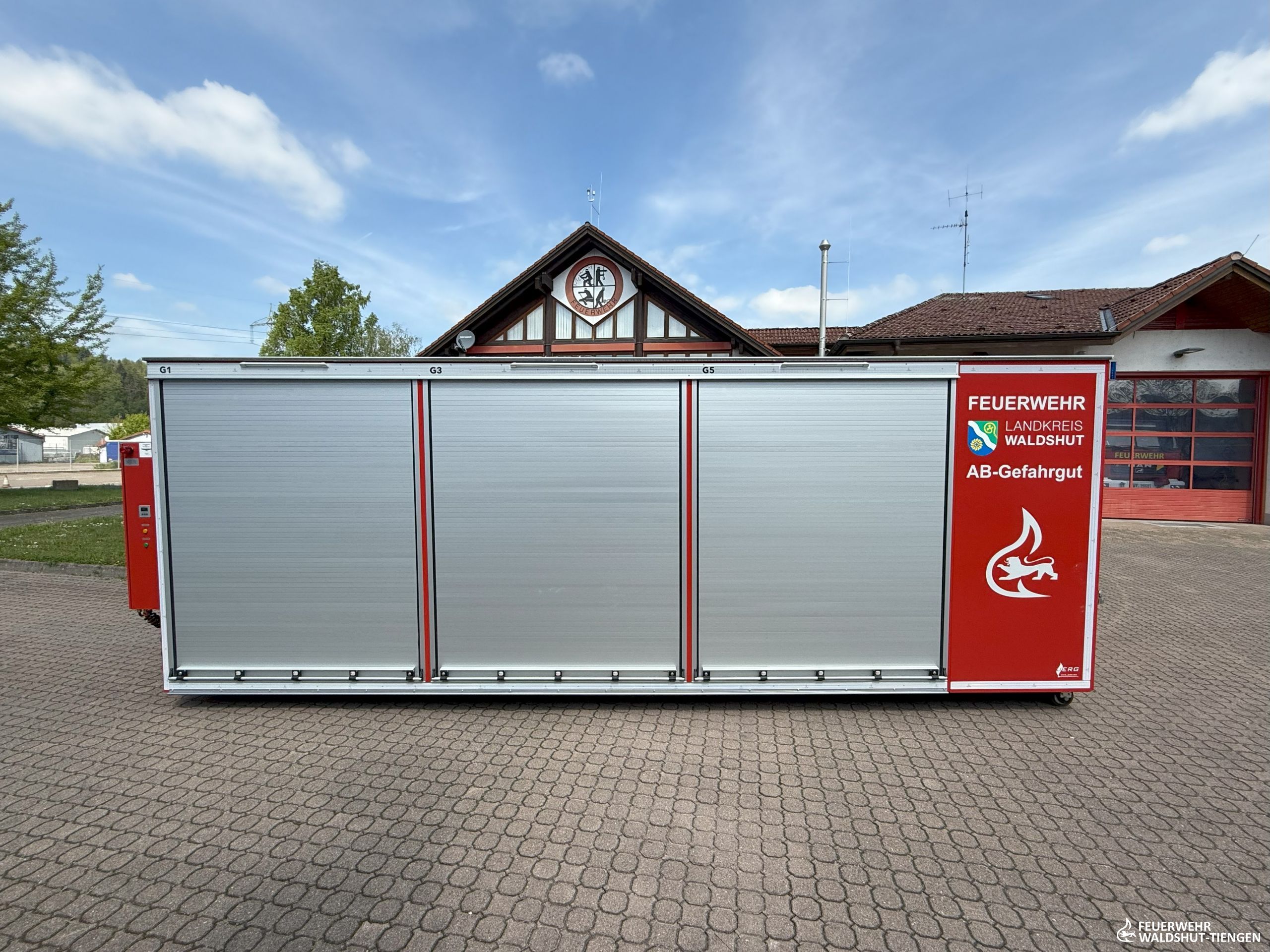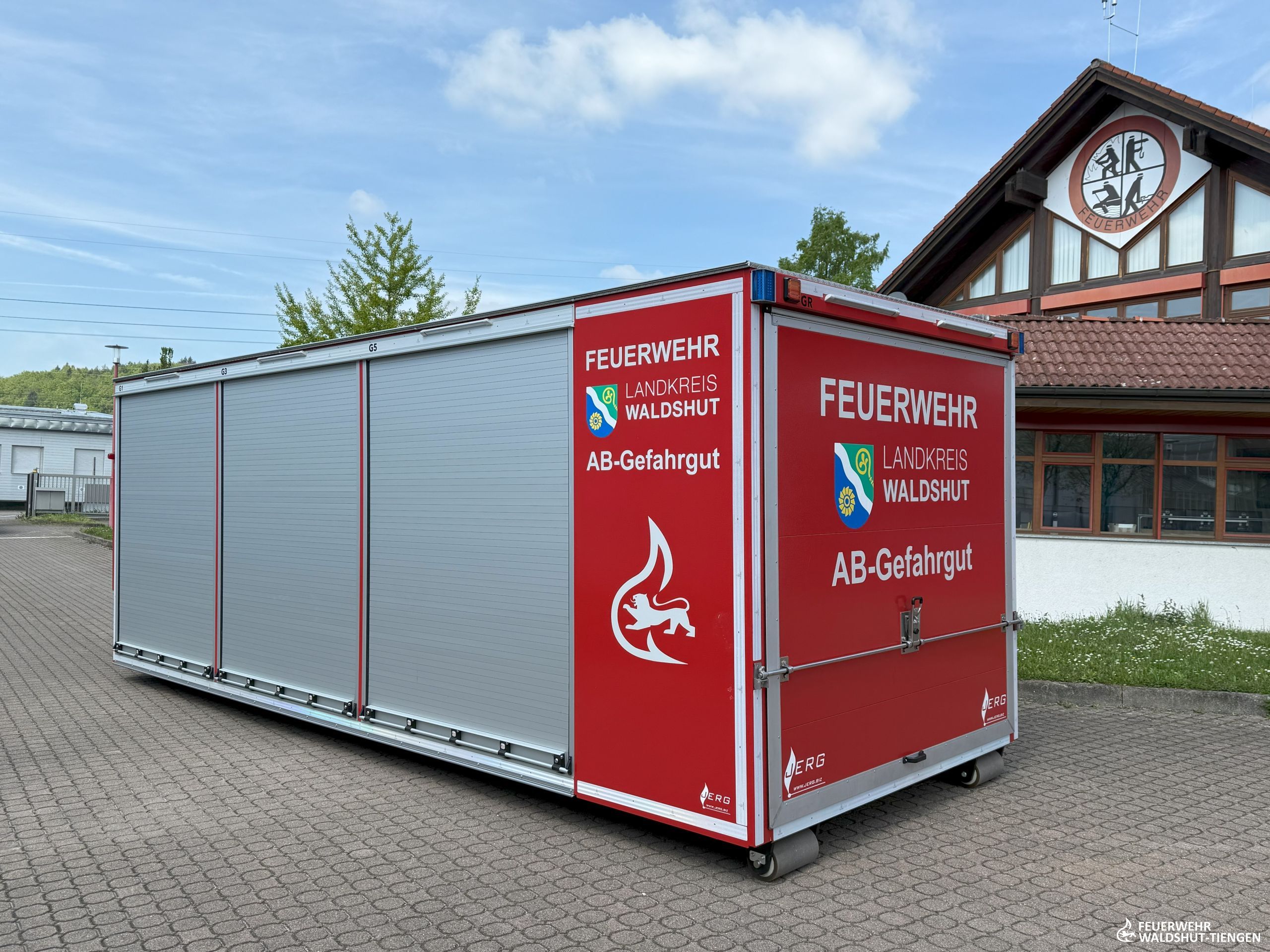 Der Abrollbehälter Gefahrgut wird bei Chemie- und Gefahrgutunfällen eingesetzt. Verladen sind Dichtmaterialien, um die Ausbreitung von Schadstoffen zu verhindern, sowie Materialien zur Beseitigung der ausgelaufenen Stoffe. Auch die persönlichen Schutzausrüstungen für die Feuerwehrkameraden, wie Atemschutzgerät und Chemieschutzanzug, sind verladen. Das Material wurde in verschiedenen Gruppen, wie z.B. Abdichten, Umfüllen/Pumpen, Auffangen oder Dekontamination zusammengestellt und auf Rollwägen verlastet. So ist die Entnahme und das in Einsatzbringen der Gerätschaften für die Einsatzkräfte erleichtert worden. Der Abrollbehälter wurde im März 2021 von der Firma Jerg dem Landkreis Waldshut als Eigentümer übergeben. Die Feuerwehr Waldshut-Tiengen wird das Gerät mit dem Gefahrstoffzug landkreisweit zum Einsatz bringen.