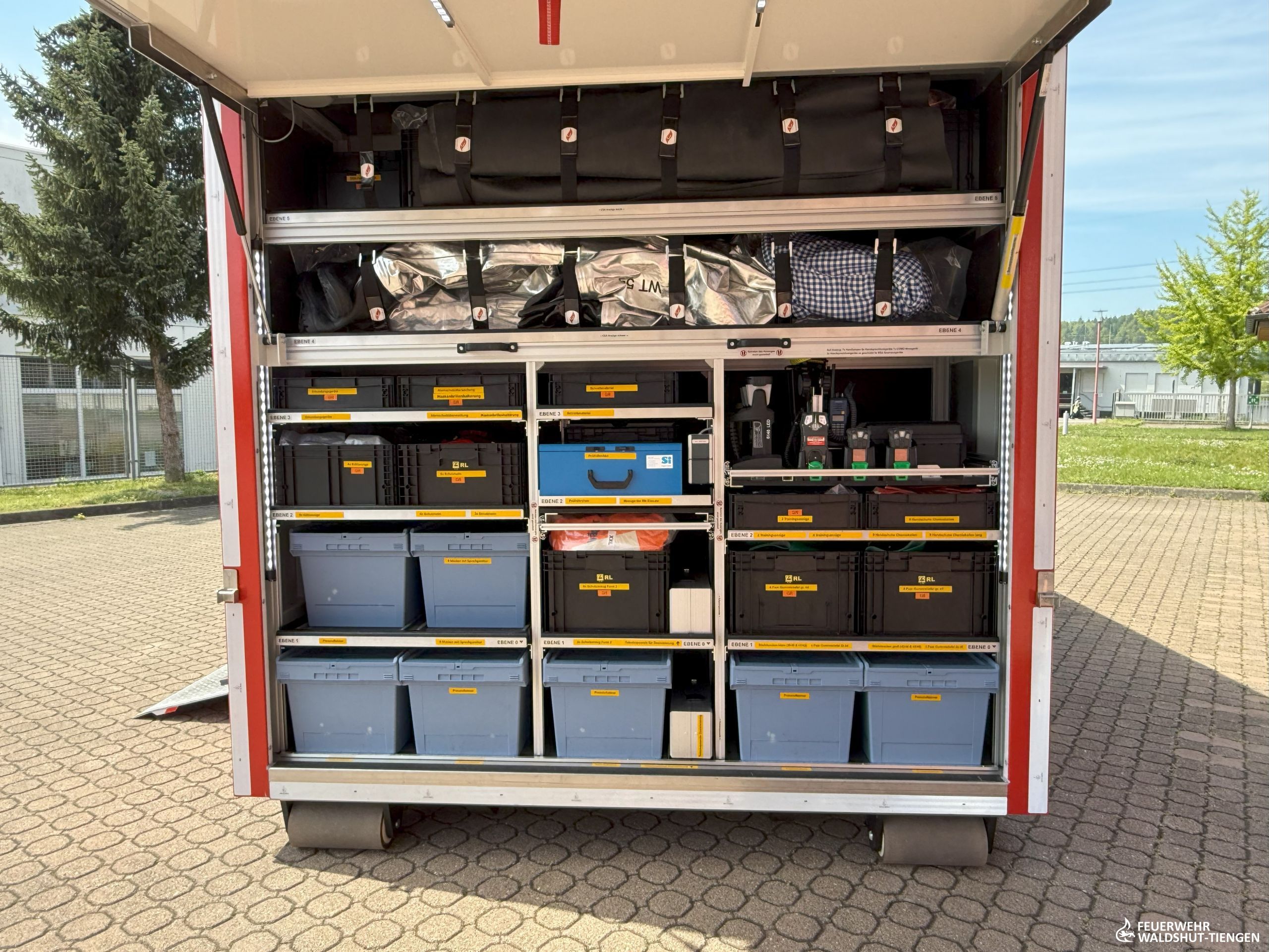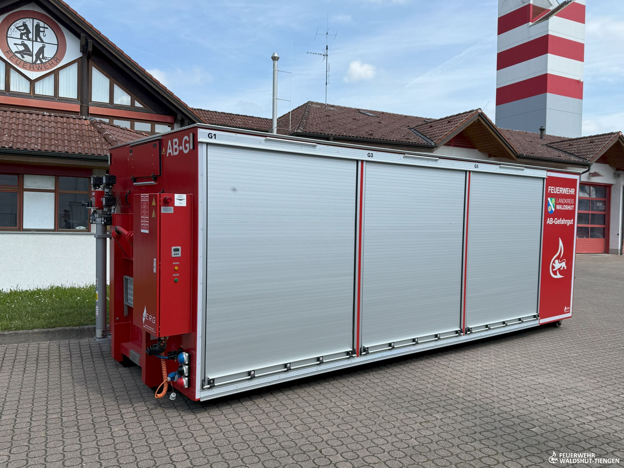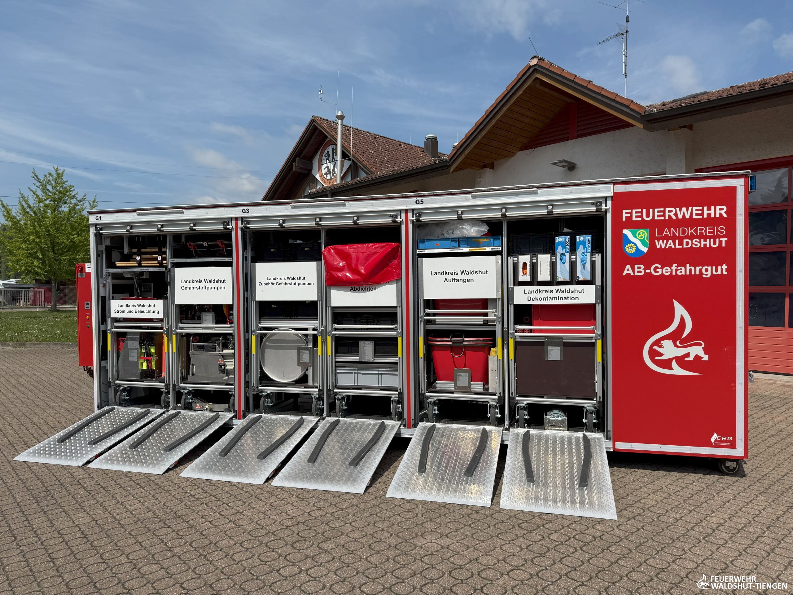 Der Abrollbehälter Gefahrgut wird bei Chemie- und Gefahrgutunfällen eingesetzt. Verladen sind Dichtmaterialien, um die Ausbreitung von Schadstoffen zu verhindern, sowie Materialien zur Beseitigung der ausgelaufenen Stoffe. Auch die persönlichen Schutzausrüstungen für die Feuerwehrkameraden, wie Atemschutzgerät und Chemieschutzanzug, sind verladen. Das Material wurde in verschiedenen Gruppen, wie z.B. Abdichten, Umfüllen/Pumpen, Auffangen oder Dekontamination zusammengestellt und auf Rollwägen verlastet. So ist die Entnahme und das in Einsatzbringen der Gerätschaften für die Einsatzkräfte erleichtert worden. Der Abrollbehälter wurde im März 2021 von der Firma Jerg dem Landkreis Waldshut als Eigentümer übergeben. Die Feuerwehr Waldshut-Tiengen wird das Gerät mit dem Gefahrstoffzug landkreisweit zum Einsatz bringen.